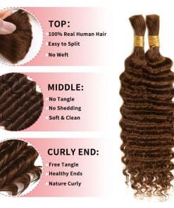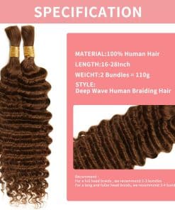 Cabello de Trenzado Humano Color Chocolate Marrón para Trenzas Boho 12A 110g 20 Pulgadas Onda Profunda Cabello Humano a Granel para Trenzar sin Trama Cabello Rizado Húmedo y Ondulado Extensiones de Cabello Humano para 2 Paquetes/Pack. Este cabello a granel de onda profunda para trenzar está hecho de cabello humano virgen brasileño sin procesar de alta calidad. La textura suave y natural del cabello rizado lo hace cómodo de usar y presenta una sensación realista. Cada paquete incluye 2 paquetes de cabello de trenzar, con un peso de 110g por paquete. Este cabello se pre-estira y es fácil de trenzar, lo que permite teñirlo, decolorarlo, rizarlo o estilizarlo con calor sin daños. Ofrece rizos definidos voluminosos con una textura apretada y ordenada y un brillo natural. Disponible en longitudes de 16 a 28 pulgadas, este cabello de trenzar está disponible en varios tonos de moda para adaptarse a tus necesidades de estilo. Perfecto para trenzas boho, trenzas en caja, twists, trenzas de hilo o locs de diosa. Adecuado para cualquier ocasión, desde fines de semana casuales hasta bodas, cumpleaños, festivales o viajes, este versátil cabello de trenzar humano eleva tu look con estilo y confianza.
