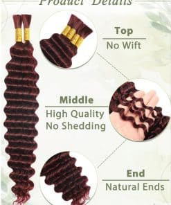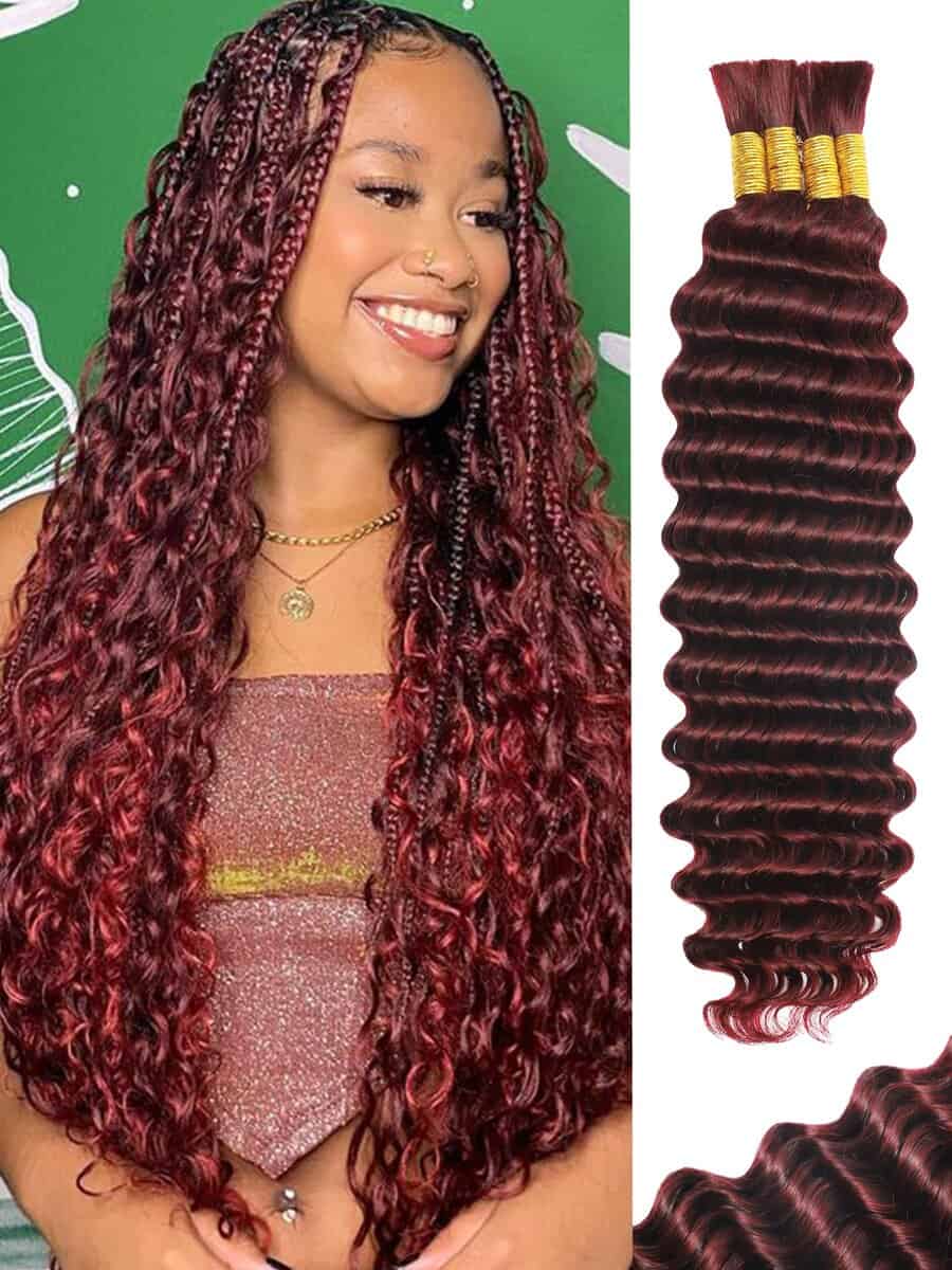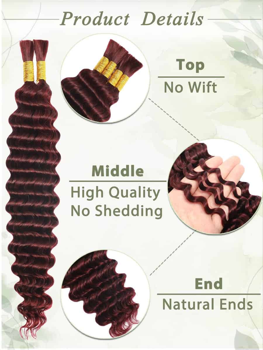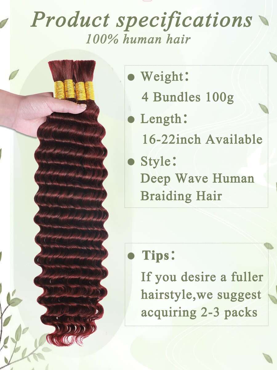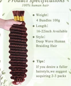 Cabello de trenzar humano de color borgoña KULYMUWIG 20 pulgadas 100 g 4 paquetes de cabello humano ondulado profundo para trenzar extensiones de cabello rizado 10A para trenzas boho húmedas y onduladas color rojo 99J. La longitud del cabello de trenzar humano es de 16 a 26 pulgadas disponible. El peso es de 100 gramos por paquete, un paquete tiene 4 paquetes de cabello ondulado profundo para trenzar. Recomendamos que compres 2 o 3 paquetes de cabello humano a granel para trenzar. El cabello de trenzar de microfibra humana está hecho de cien por ciento de cabello humano virgen brasileño no procesado, cortado de mujeres jóvenes y saludables; esponjoso y brillante; completo y grueso. El cabello a granel ondulado profundo para trenzar micro rizos se puede blanquear; teñir; pre estirar puntas suaves; sin enredos y sin caída. Después de ser trenzado, el cabello de trenzar humano puede durar varios meses. El cabello de trenzar rizado para trenzas boho no tiene trama. Todas las cutículas intactas y alineadas en la misma dirección, y nuestro cabello humano a granel para trenzar es adecuado para una variedad de estilos de trenzado. Sin productos químicos; cien por ciento cabello humano. El cabello humano a granel para trenzar está limpio y suave. El cabello humano para trenzas boho se puede blanquear; teñir; ondular y peinar