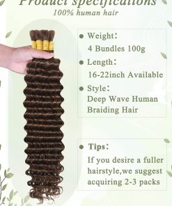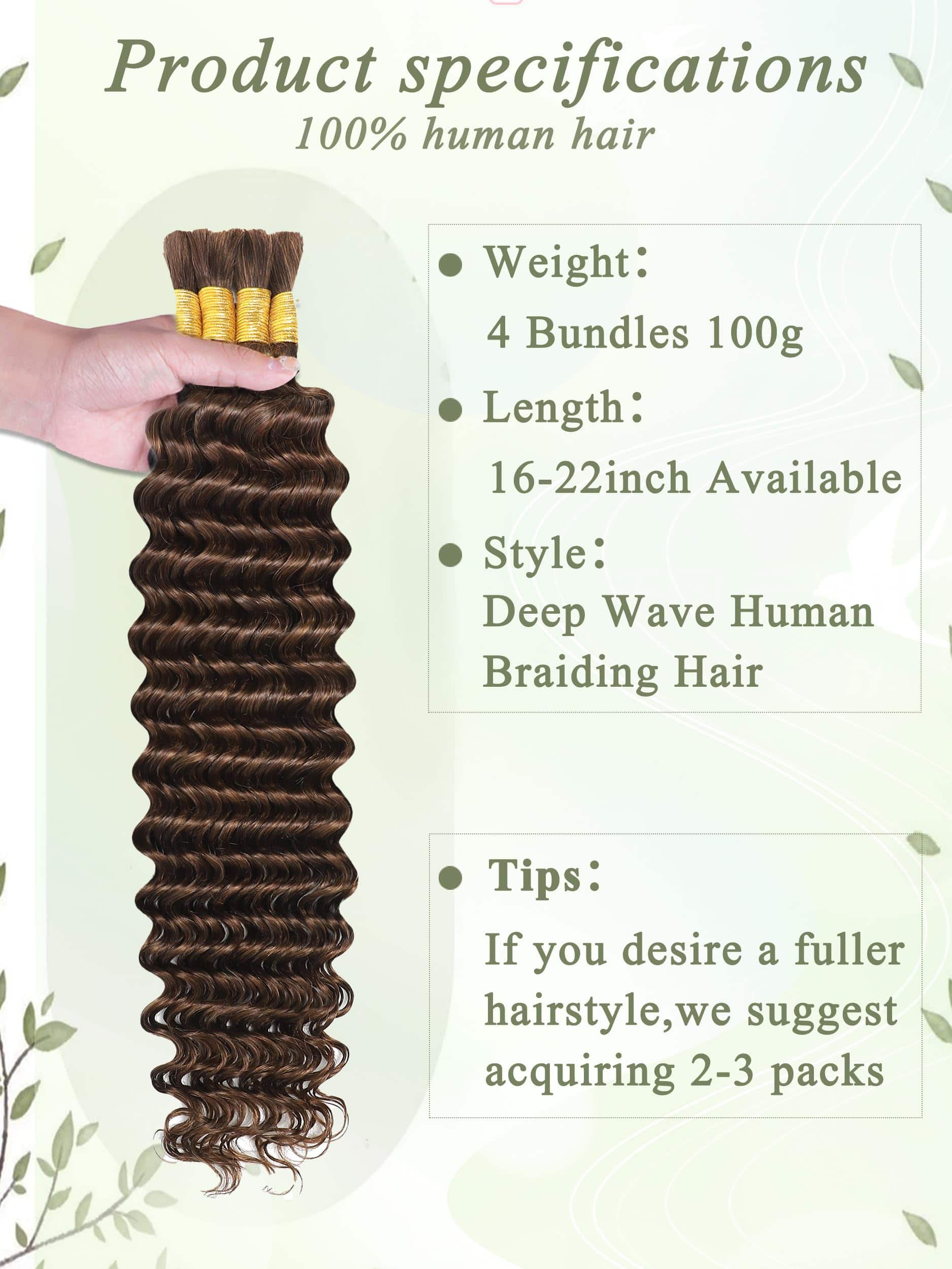 1. Longitud y peso del cabello de trenzar: La longitud del cabello de trenzar humano va desde 16 a 26 pulgadas. El peso es de 100 gramos por paquete, cada paquete tiene 4 trenzas de ondas profundas. Recomendamos comprar 2 o 3 paquetes de cabello humano a granel para trenzar.