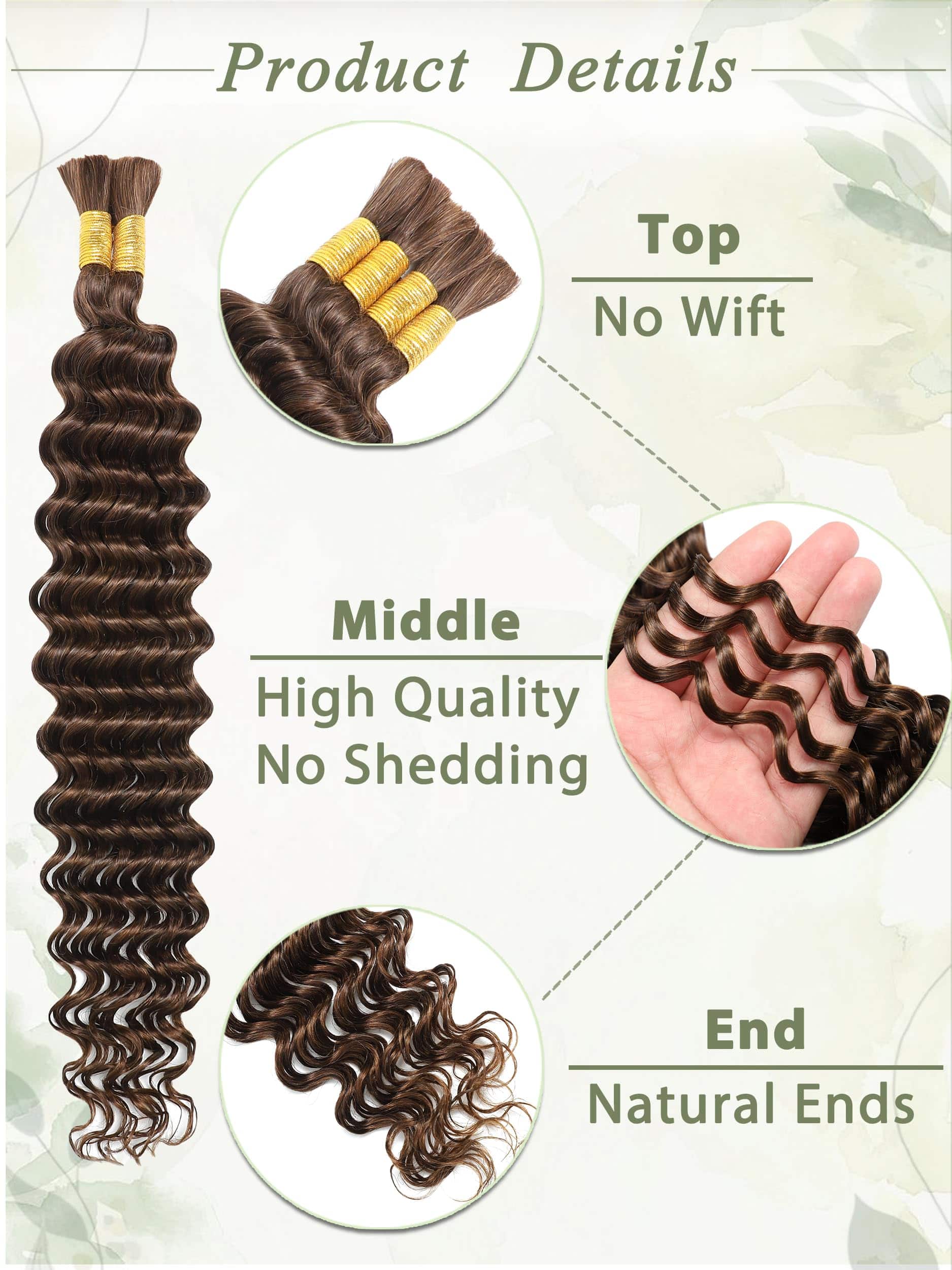 3. Calidad del Cabello de Trenzar Humano: El cabello humano a granel de ondas profundas para micro trenzas se puede decolorar; teñir; pre-estirar las puntas suaves; no se enreda y no se cae. Después de ser trenzado, el cabello de trenzar humano puede durar varios meses.