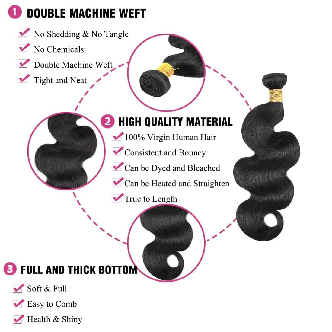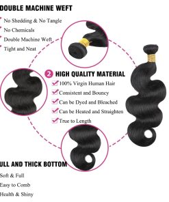 2. Calidad de los Paquetes de Cabello Ondulado del Cuerpo: Doble Trama de Máquina, Paquetes de Cabello Humano de Brasil, Trama Apretada y Ordenada, Libre de Enredos y Caída, Extremo Grueso y Saludable, Elasticidad y Volumen, Sin Olor, Suave y Completo, Cabello Humano Liso y Sedoso. Puede ser Alisado, Rizado y Estilizado Como su Propio Cabello.