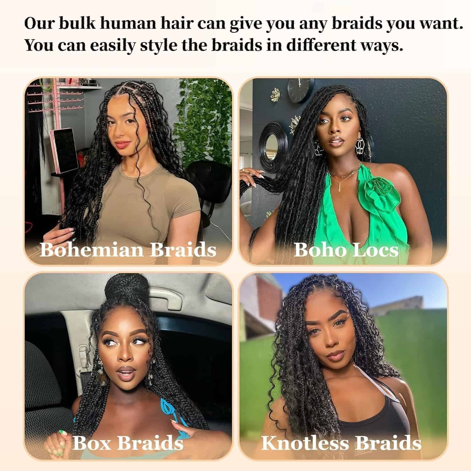 2. Calidad del Cabello Humano suelto Para Trenzas: Puede ser Alisado, Rizado, Decolorado, Teñido, Permanente y Estilizado como su Propio Cabello. Sin Trama, Sin Enredos, Sin Caída.