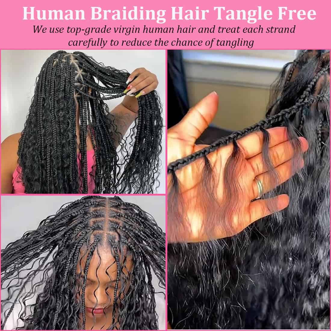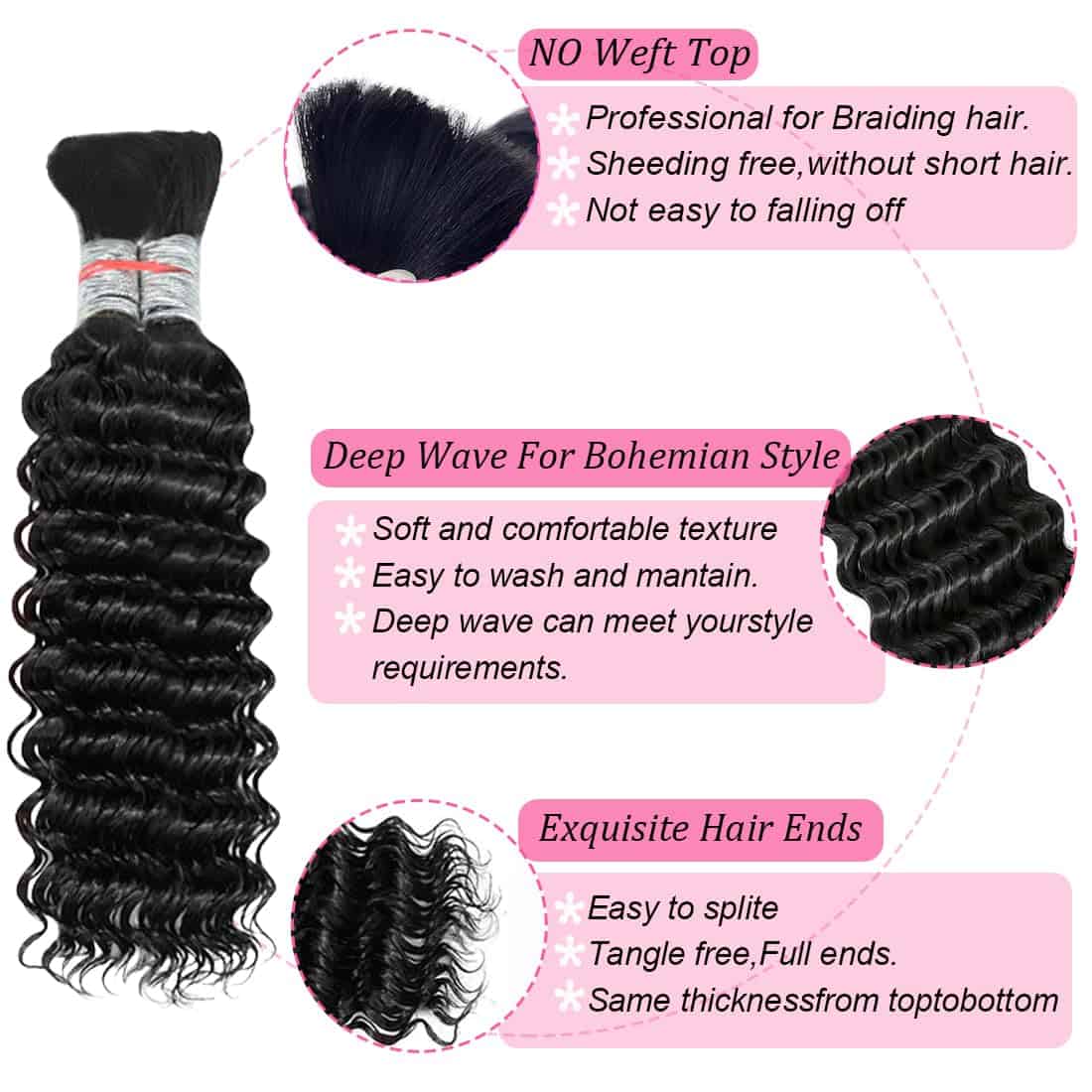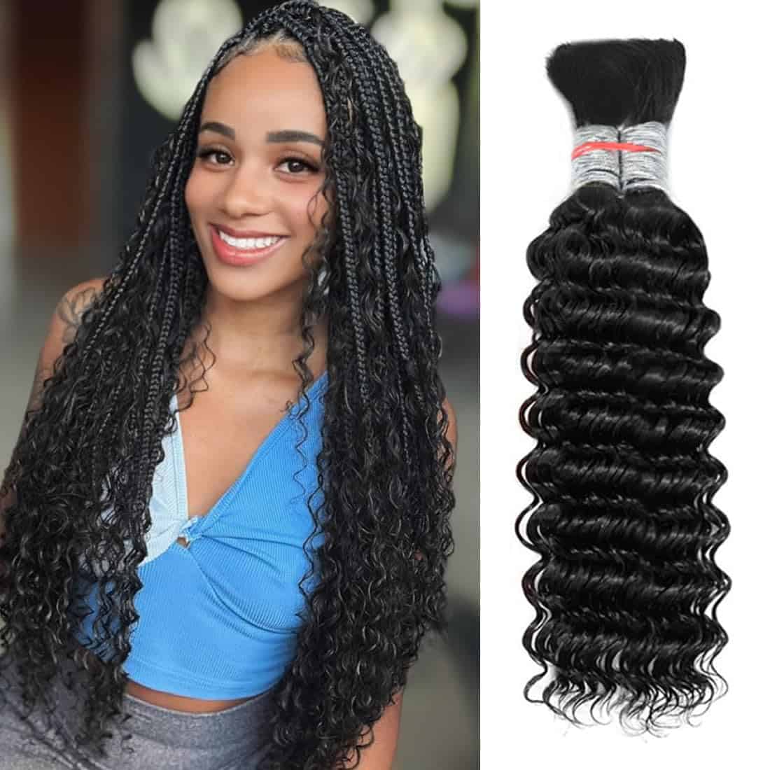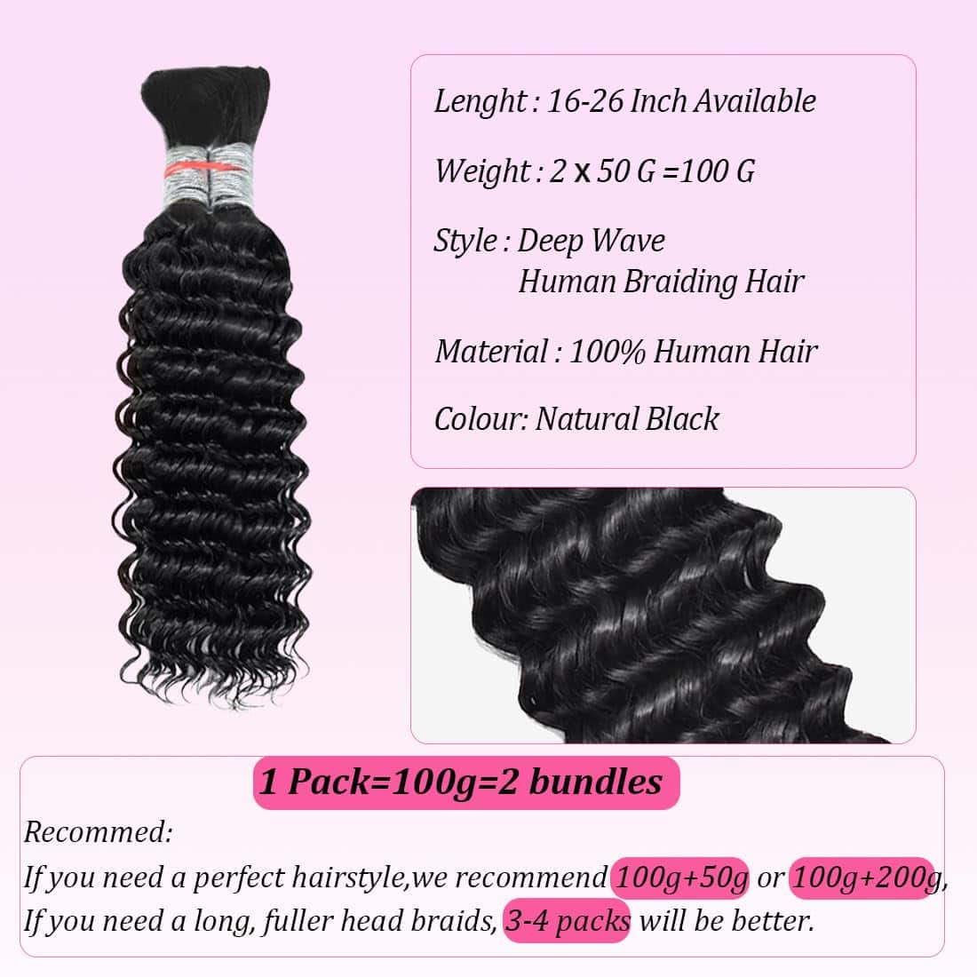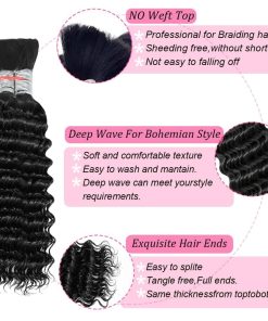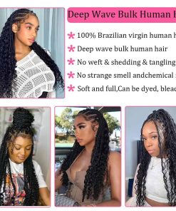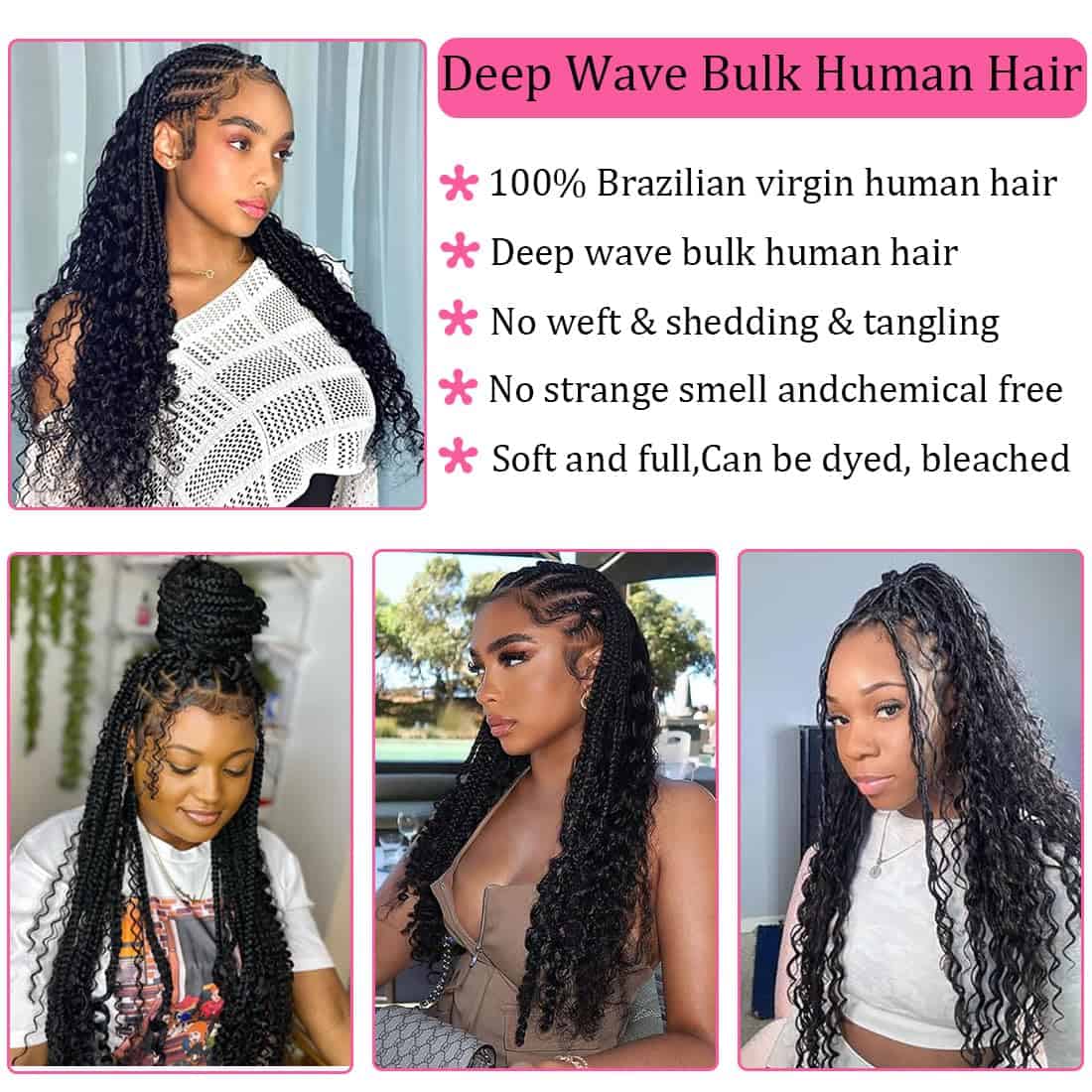 Cabello humano a granel en ondas profundas sin trama para trenzar con estilo bohemio. El cabello humano virgen brasileño no procesado es suave, suave y saludable, perfecto para trenzas sin nudo. La calidad del cabello para trenzas bohemias es excepcional, sin enredos ni pérdidas, grueso y esponjoso, con todas las cutículas intactas y alineadas en la misma dirección. Este cabello para trenzar en ondas profundas se puede teñir, decolorar y restilizar según tus preferencias. Con una longitud de 16 a 26 pulgadas y un peso de 100 g por paquete (2 paquetes en uno), se recomienda comprar 3-4 paquetes para una cabeza completa. El diseño especial del cabello para trenzas bohemias, sin trama, lo hace perfecto para trenzar, como trenzas bohemias, trenzas sin nudos, trenzas de caja, trenzas cosidas y más. Además, puedes usarlo para crear tus propias extensiones de cabello. Este cabello para trenzar en ondas profundas es duradero, fácil de mantener y se puede reutilizar. Si tienes cualquier pregunta, nuestro equipo de servicio al cliente estará encantado de ayudarte.
