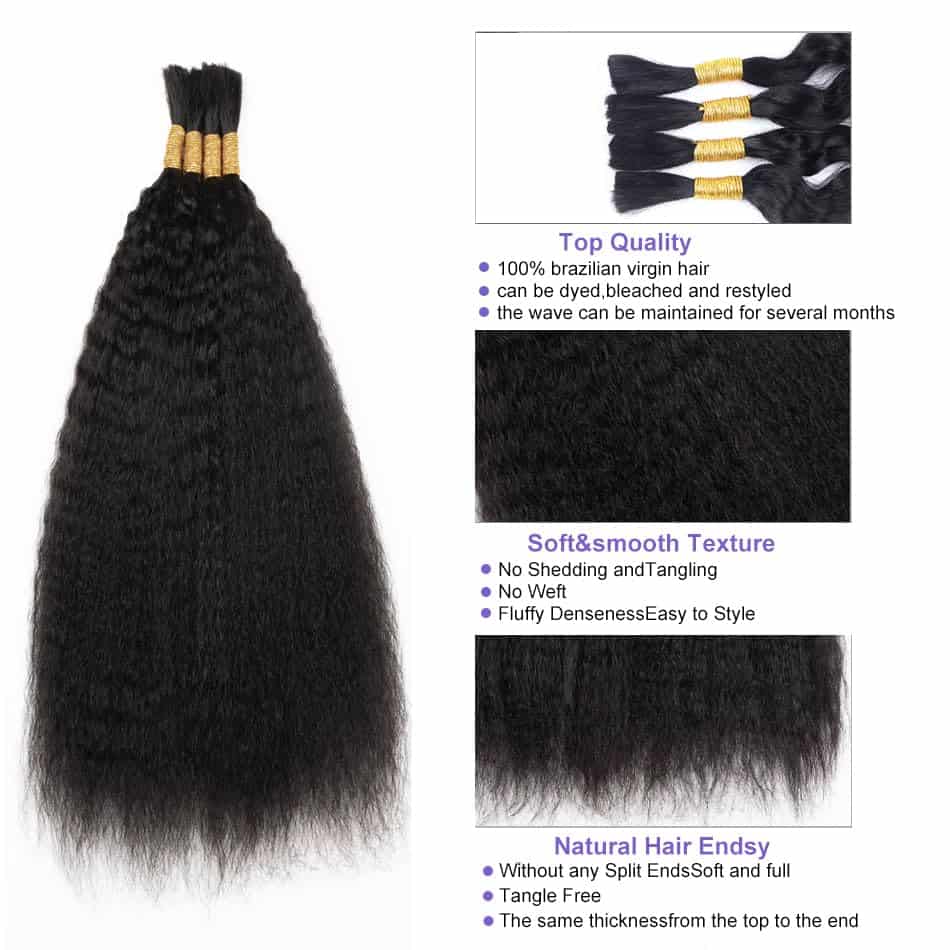 1. Material de Cabello Humano de Primera Calidad: El Cabello Trenzado Humano Kinky Straight de RLHAIR utiliza 100% Cabello Humano Virgen Brasileño 12A que se Recoge de un único donante sin Alteraciones Químicas ni Tratamientos. Es Natural y Saludable, Suave y Esponjoso, Lleno y Grueso. 2. Textura Agradable, Esponjosa y Brillante: El Cabello Yaki Straight Grueso de RLHAIR para Trenzar es Natural y Saludable, Esponjoso y Brillante, Suave y Sedoso, Fácil de Trenzar. Sin puntas abiertas, sin enredos, sin caída, Muy limpio, Tu cuero cabelludo no resultará dañado. 3. Sin Trama, Apto para diversas ocasiones: El Cabello Grueso Kinky Straight para Trenzar sin trama de RLHAIR puede satisfacer tus diferentes necesidades de estilo de cabello. Se puede alisar, teñir, decolorar, rizar y restylear. Apto para diversas ocasiones, se puede utilizar para peinados de bodas, viajes, fiestas, citas o vida diaria. Fácil de hacer Trenzas Bohemias, Trenzas Boho, Trenzas de Caja, Trenzas Holandesas, Trenzas Francesas, Trenzas sin nudos grandes, Cola de caballo, Trenzas, etc. 4. Ventajas Únicas del Producto: En comparación con otras extensiones de cabello, el Cabello Trenzado Humano Kinky Straight sin trama de RLHAIR no dañará tu cuero cabelludo, es la extensión de cabello más adecuada para trenzar. Después de trenzarlo, puede mantenerse durante varios meses, siendo una inversión duradera en tu cabello. 5. El peso: 100g/Pack/4PCS (25g/Bundle) El Peso del Cabello Grueso Kinky Straight para Trenzar es de 100g por Paquete. Si te gustan las trenzas de cabeza completa, te recomendamos que compres 3-4 paquetes. Un paquete tiene 4 mechones, el peso de un solo mechón es de 25g.