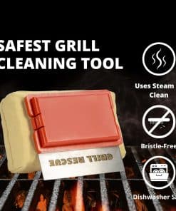 Keep your family safe with our bristle-free grill brush! Unlike traditional wire brushes, there are no dangerous bristles to break off and end up in your food. Grill Rescue’s BBQ cleaning brush is a safer alternative for gas, charcoal, porcelain, ceramic, cast iron, and stainless steel grates. Nuestro cabezal de limpieza premium para parrillas es resistente al calor de hasta 600 F y cuenta con una capa de fibra de Aramida de alta temperatura, garantizando un uso duradero. ¡Es la herramienta ideal para barbacoas de alta resistencia para los residuos de barbacoa más difíciles y pegajosos, y es apto para lavavajillas para una limpieza fácil!
