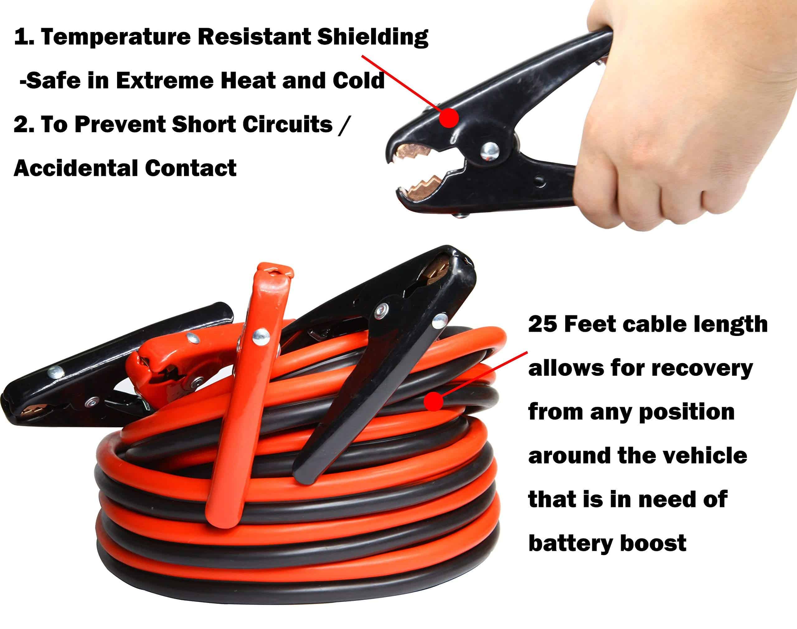 Garantía: Su compra está respaldada por nuestra sólida garantía de satisfacción de por vida. Aplicación: Funciona con todo tipo de vehículos, incluidos coches, furgonetas, camiones y tractores. Estos cables de arranque de alta resistencia son capaces de proporcionar el flujo de corriente eficiente necesario para todas sus necesidades automotrices Material: Blindaje resistente a la temperatura – seguro en calor y frío extremos (-40 ° F); 100% de CCA altamente conductivo (aluminio recubierto de cobre): Permite la transferencia de energía de 800 amperios y es adecuado para baterías de 12 V y 24 V; Material de PVC extra resistente: Asegura calidad y seguridad, ya que están diseñados para una resistencia excepcional a impactos y protección aislada. Diseño: Diseñado ergonómicamente con superficies de abrazadera blindadas para mayor seguridad. Las abrazaderas recubiertas de PVC rojo y negro facilitan la identificación durante los arranques. El estuche de transporte está diseñado para un almacenamiento rápido y fácil. Longitud: La longitud del cable de 25 pies permite la recuperación desde cualquier posición alrededor del vehículo que necesite un impulso de la batería. Incluso cuando no hay acceso desde el frente o los lados, los cables llegan a la longitud completa del vehículo, lo que le brinda la capacidad de arrancar desde detrás de un vehículo. Auto Parts Depot SIEMPRE PROPORCIONA PIEZAS DE AUTOMÓVIL DE ALTA CALIDAD Y SERVICIO. Si recibe los artículos con problemas de calidad o dañados, envíenos un correo electrónico de inmediato y le proporcionaremos algunas sugerencias profesionales. Si nuestros productos cumplen con sus requisitos, por favor, dennos algunas buenas calificaciones y ánimo para ayudarnos a avanzar en una dirección mejor. ¡Muchas gracias!
