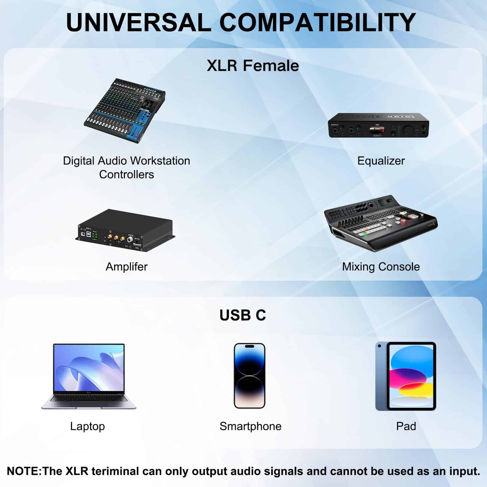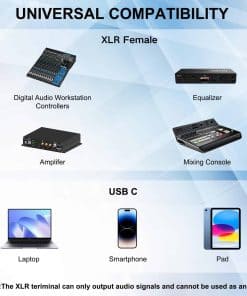 Descripción: Este Cable de Audio USB C a Doble XLR Hembra es un accesorio esencial para músicos, ingenieros de audio, DJs y audiófilos. Elimina la necesidad de adaptadores o convertidores adicionales, ahorrándote tiempo y dinero. Su compatibilidad con varios dispositivos y su fácil configuración plug-and-play lo hacen muy conveniente para uso con Amplificadores, Altavoces Activos, Consolas de Mezcla. Haz tu pedido y experimenta la conveniencia y la calidad de sonido superior del Cable de Audio USB C a Doble XLR Hembra.