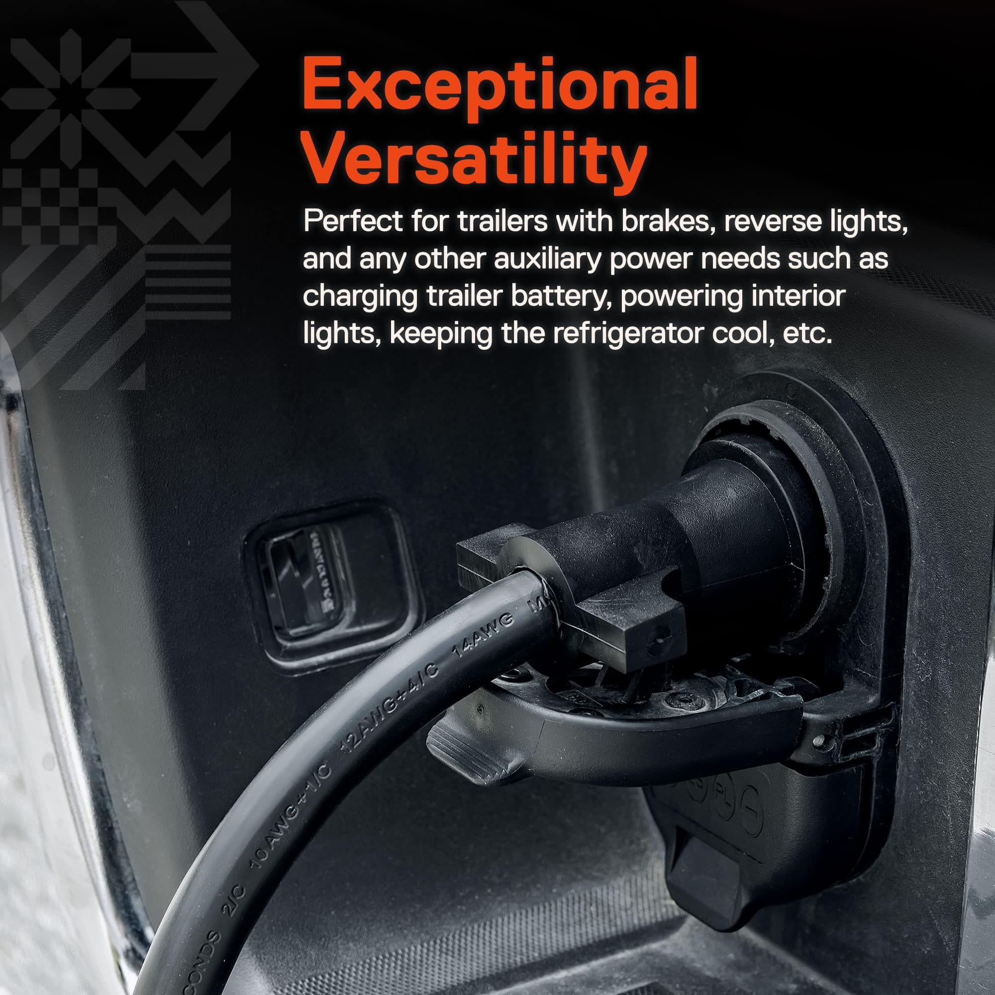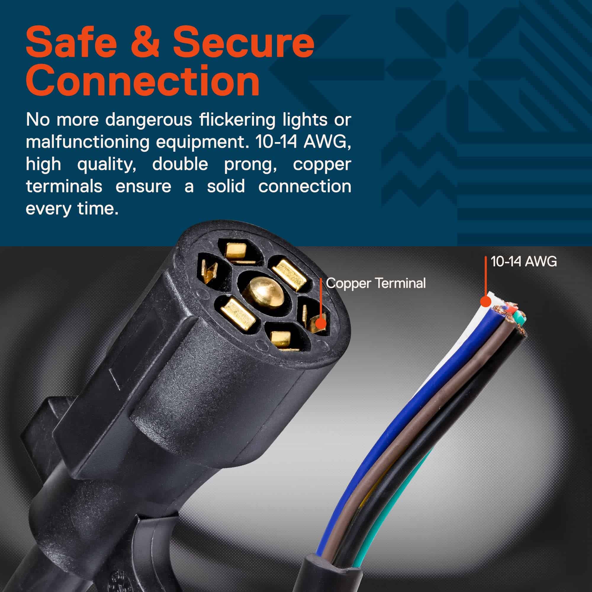 No hay necesidad de seguir limpiando y pegando ese viejo enchufe de remolque desgastado y sucio. Reemplazarlo no podría ser más fácil con este completamente nuevo y resistente cable y enchufe tipo hoja de 7 vías. Nuestros cables se envían listos para instalar con un trabajo mínimo. La resistente chaqueta de PVC ya está pelada para permitir una conexión rápida y sin dolor en la caja de conexiones. La ubicación de los colores de los cables cumple con el diseño estándar de 7 vías de RV, por lo que no es necesario adivinar dónde va cada cable. Construcción pesada para un rendimiento duradero Fabricado para sobresalir. Este cable está hecho con materiales de la más alta calidad y es perfecto para su RV, remolque de caballos o camión de comida. Los cables de cobre completamente aislados de calibre 10 a 14 proporcionan durabilidad, longevidad y seguridad. Los terminales de cobre puro aseguran una excelente conductividad. La resistente carcasa de PVC moldeado por completo es a prueba de mal tiempo, resistente a la corrosión y evita fallas por desgaste y abrasión. Tranquilidad al Remolcar con una Conexión Ultra Segura Otras empresas utilizan un conector de un solo prisma débil en el extremo del enchufe de sus cables. Nosotros no. Nuestro enchufe de dos pines superior y con bloqueo se agarra con la máxima fuerza y no se suelta fácilmente. Qué se Incluye (1) Cable de Remolque de 16 pies (1) Manual de Instrucciones
