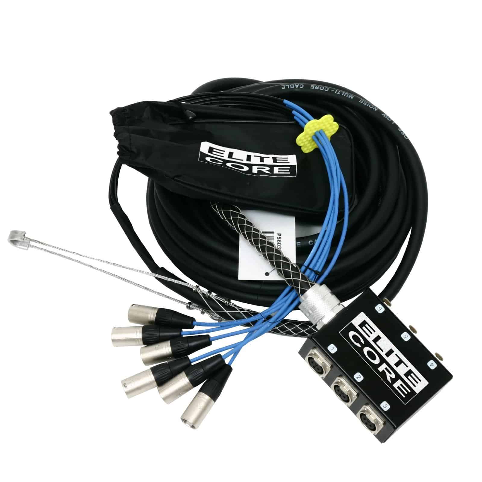 Elite Core 6 Channel 30′ Pro Audio Stage Snake es un cable de escenario profesional diseñado para proporcionar una conexión de alta calidad entre tus dispositivos de audio. Cada uno de los 6 canales cuenta con líneas blindadas de calibre 24 con lámina de aluminio y cable de drenaje para garantizar una transmisión sin interferencias de la señal. Todos los canales y retornos están totalmente balanceados y blindados para minimizar la interferencia externa y garantizar una calidad de audio óptima. Los conectores XLR soldados a mano ofrecen una conexión segura y duradera. Además, cada cable de escenario viene con una bolsa para cubrir la caja de escenario o abanico durante el transporte o almacenamiento, lo que ayuda a protegerlo y mantenerlo en condiciones óptimas. Con una longitud de 30 pies, este cable de escenario es ideal para su uso en conciertos, estudios de grabación, teatros y más.