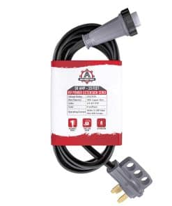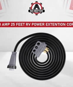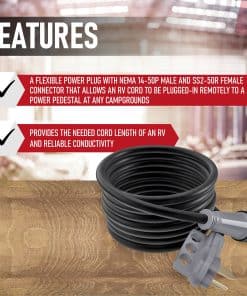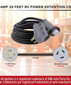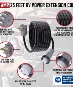 Este cable de extensión de alimentación para RV de 25 pies es de calibre pesado y está hecho de material de cable premium de 100% cobre, envuelto con un cordón de PVC resistente a la llama y al calor y probado para uso en exteriores. Cuenta con un conector macho NEMA 14-50P y hembra SS2-50R que permite conectar el cable a una toma de corriente de forma remota en cualquier campamento. Fabricado por AA Ignition, este adaptador de alimentación viene con un extremo hembra de 90 grados que ayuda a reducir la presión al conectarlo a una toma de corriente y un candado retorcido con anillo roscado diseñado para seguridad y para mantener la batería cargada por un largo período de tiempo. Además, cuenta con un indicador de luz LED para saber si está correctamente conectado a la fuente de alimentación. Carga un valor máximo de potencia de 125 voltios y 12,500 vatios. También viene con una garantía de reemplazo en caso de falla.