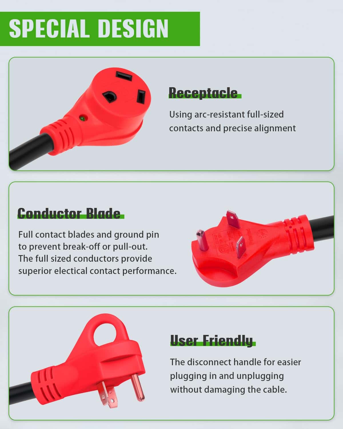 1. CALIFICACIÓN DEL CABLE DE RV: Cable de extensión de RV de 30 AMP 30 FT, 6AWG3C 8AWG1C con enchufe macho NEMA TT-30P y receptáculo hembra NEMA TT-30R de RV, clasificado para 3750Watt(125V), COLOR: Aleatorio, no afecta el uso.