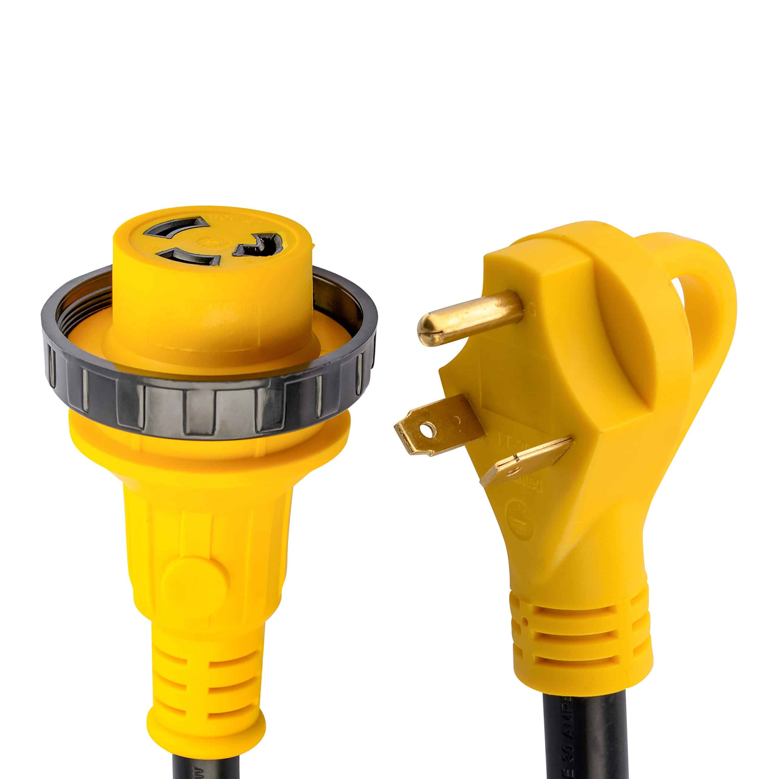 2. Conector macho de 30 AMP de 3 clavijas (TT-30P) y hembra de giro con bloqueo (L5-30R): Cuenta con un enchufe macho de 3 clavijas (TT-30P) con un mango de agarre conveniente para una conexión y desconexión fácil, y un conector hembra con bloqueo de giro (L5-30R) para una conexión segura a su RV.