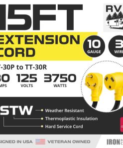 DISEÑADO PARA USO RUGOSO AL AIRE LIBRE – La cubierta de vinilo flexible protege este cable de alimentación para RV contra la humedad, la luz solar y el desgaste de los elementos exteriores. CONDUCTIVIDAD SUPERIOR – El cable de 30 amperios para RV de Iron Forge Cable está construido con alambre de cobre de calibre pesado de 10 para una conductividad superior. CUCHILLAS REFORZADAS protegen los clavijas del cable de extensión de 30 amperios para RV de doblarse o romperse. Diseño antideslizante. Rango de temperatura: -40 F a +140 F. CABLE de alambre de calibre pesado de 10 UL CERTIFICADO, 15 pies, 30 amperios macho a 30 amperios hembra, 125 voltios, 3750 vatios. VETERANO PROPIETARIO. GARANTÍA DE REEMPLAZO DE POR VIDA – Iron Forge Cable respalda todos sus cables para RV al 100%. Regístrese en línea para obtener un .