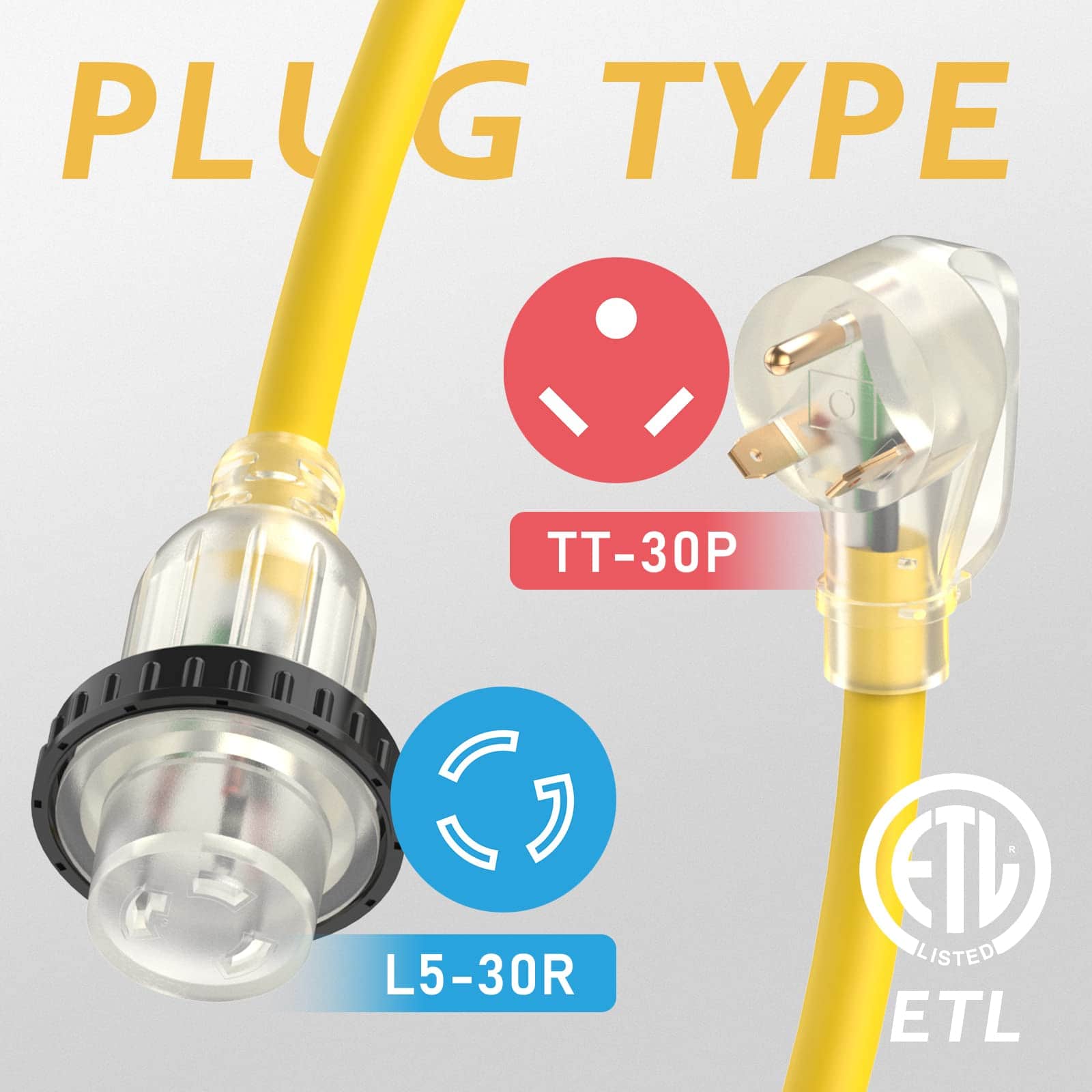 3. Enchufe NEMA TT-30P y receptáculo bloqueable NEMA L5-30R, 30A 125V 3750W, cable de alimentación STW, aprobado por ETL.