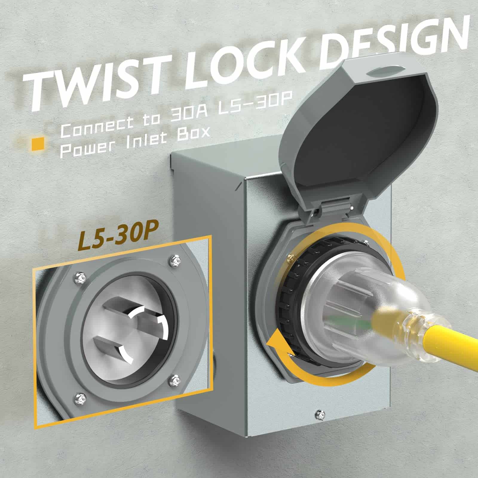 2. El diseño con bloqueo de giro en la hembra mantiene el cable de alimentación en una posición fija, protegiendo la conexión del polvo y la lluvia.