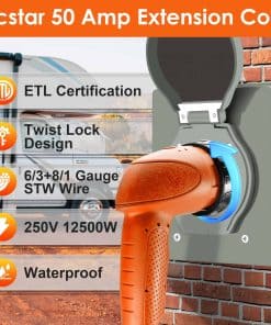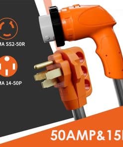 Especificaciones: Conector de bloqueo NEMA 14-50P a NEMA SS 2-50R. Clasificación: 125/250V, 6250/12500W. Indicador de energía LED: Conector macho de 50 amperios a hembra de 50 amperios con bloqueo, un enchufe moldeado a prueba de agua con anillo roscado para una conexión a prueba de mal tiempo, y el indicador de energía LED se iluminará de verde cuando haya energía. Mango de agarre rápido: Los extremos del cable de extensión de energía RV de 50 amperios están diseñados con mangos ergonómicos de agarre, lo que hace que sea mucho más fácil quitarlo de un enchufe u toma, ahorrando efectivamente fuerza física. Funciona en temperaturas de -40 F hasta +221 F. Aplicaciones: Este cable adaptador de RV es ideal para furgonetas camperas, remolques, autocaravanas, caravanas, suministrando energía rápidamente a electrodomésticos domésticos. Aprobado por ETL.