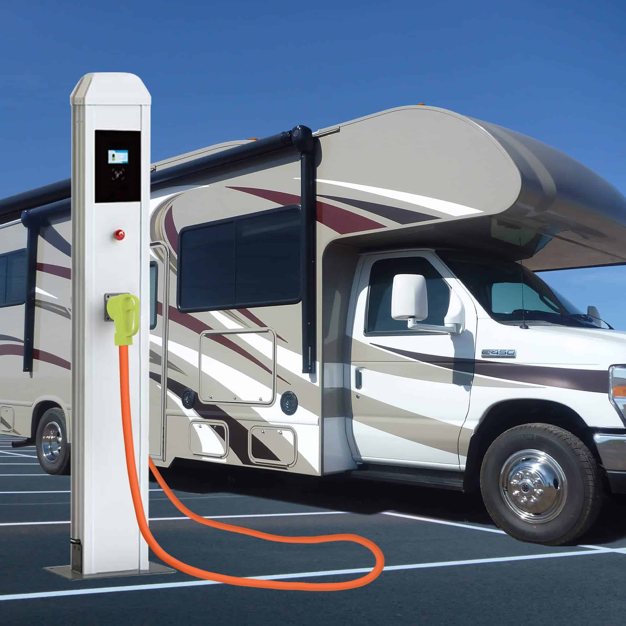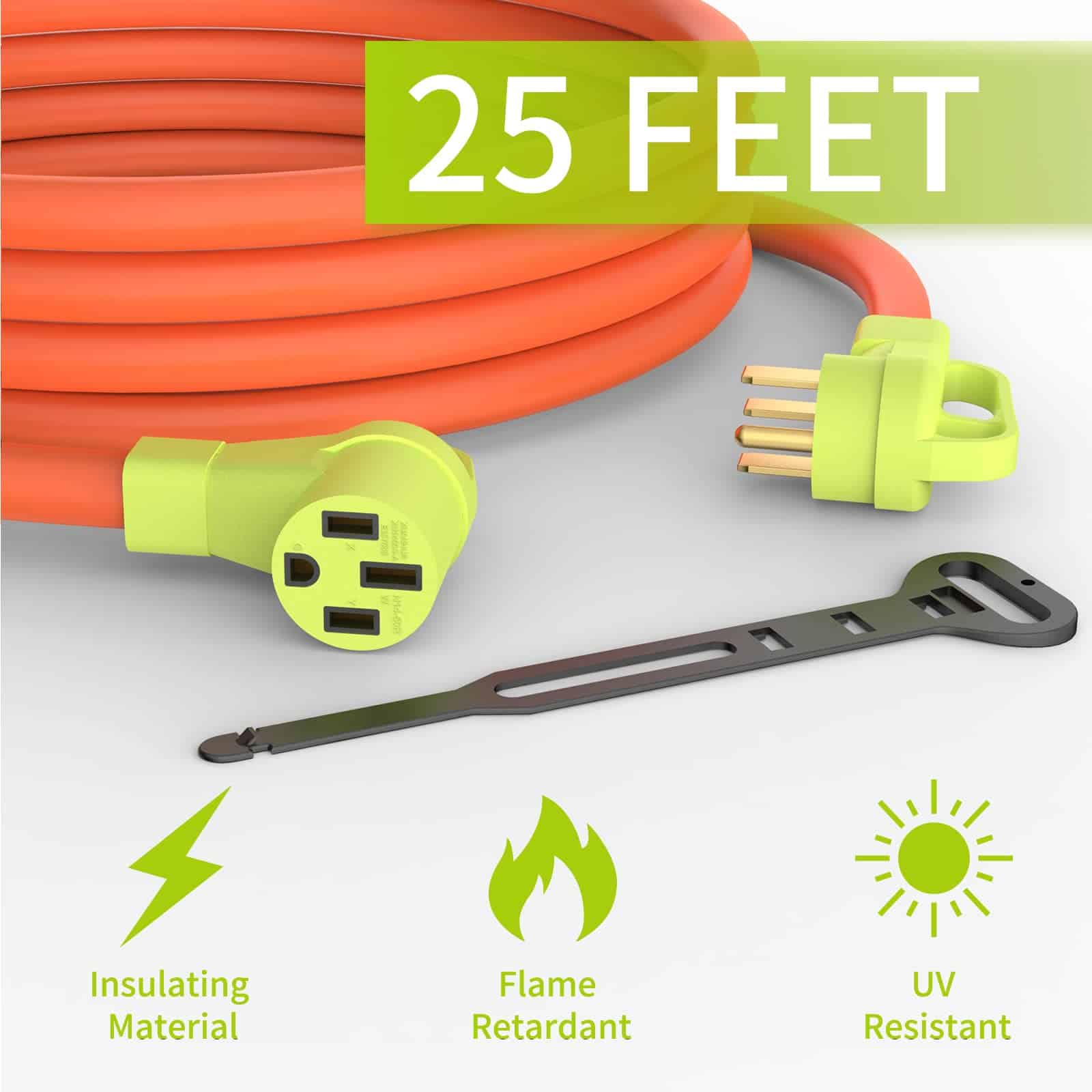2. Longitud del cable de extensión RV de 25 pies, perfecto para distancia de carga, ideal para uso en campamentos, parques de RV, estaciones de carga de vehículos eléctricos y muchos otros usos en exteriores / interiores.