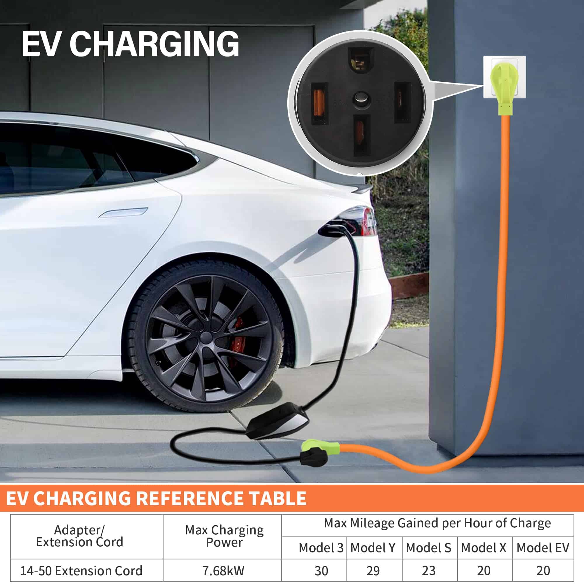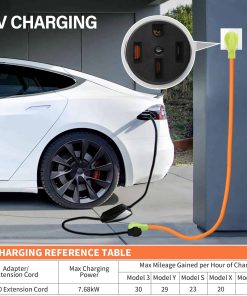 3. Extensión de carga de VE Adecuada para carga de VE de Nivel 2, potencia de carga máxima 7.68KW, autonomía máxima por hora de carga Model 3 es de 30 MPH, Model Y es de 29 MPH, Model S es de 23 MPH.