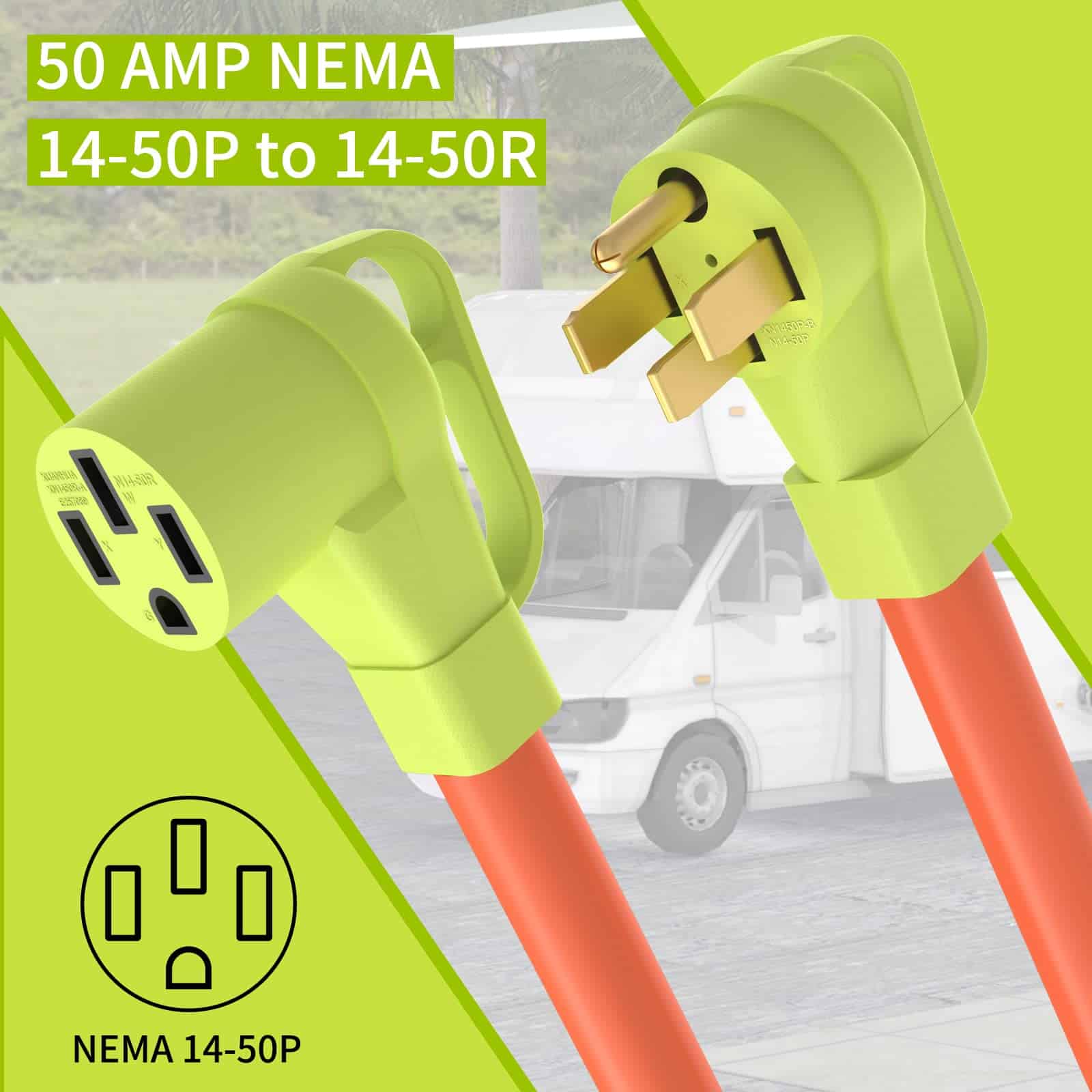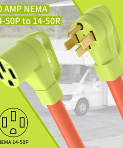 1. Especificación del producto Cable de extensión RV de 50 amperios de NEMA 14-50P a enchufe de 14-50R, 125/250 voltios, potencia máxima de 12500 vatios.