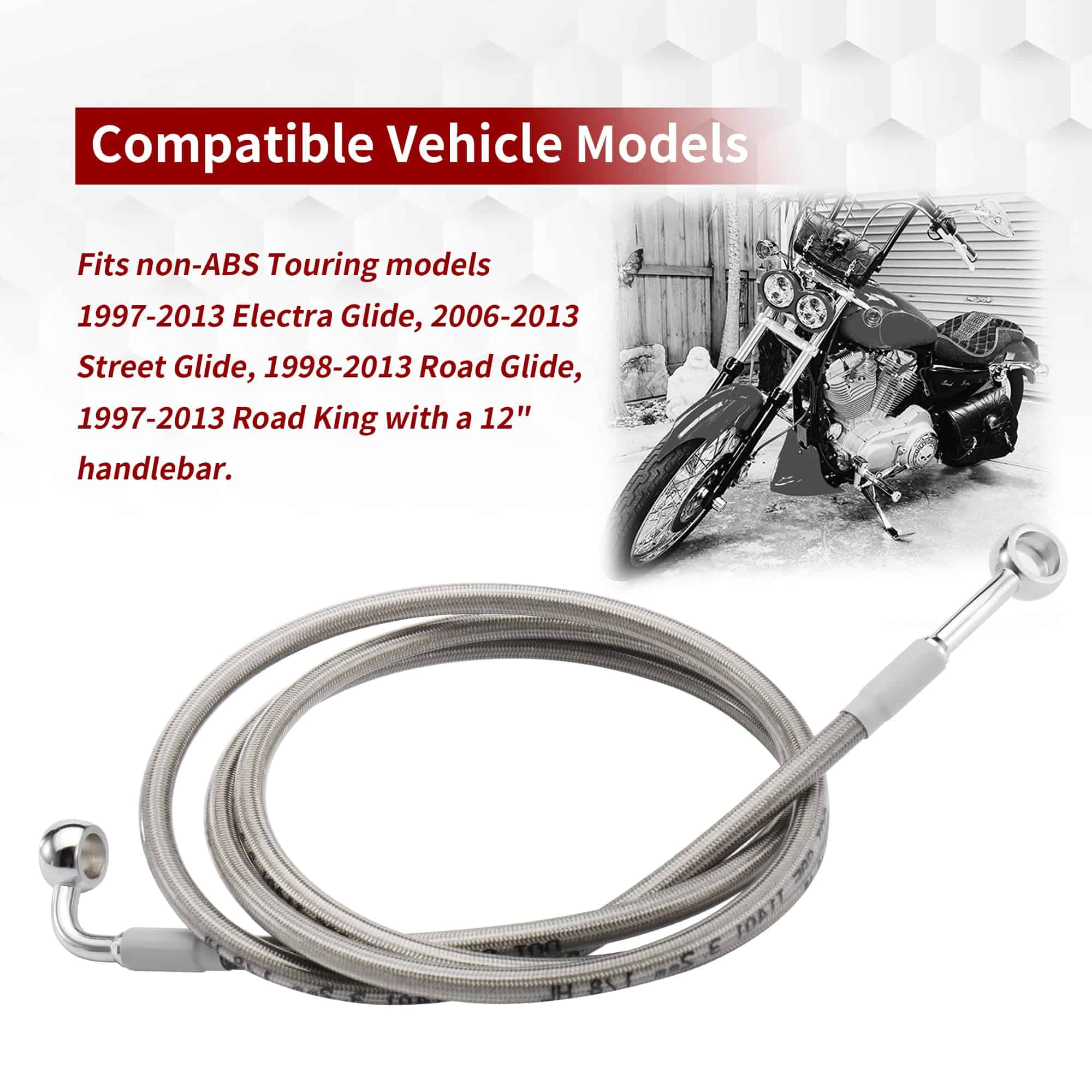 Compatibilidad: Se ajusta a los siguientes modelos Touring sin ABS con un manillar de 12″: 1997-2011 Electra Glide Classic EFI FLHTCI 1997-2013 Electra Glide Classic FLHTC 1997-2009 Electra Glide EFI FLHTI 1997-2009 Electra Glide FLHT 1997-2011 Electra Glide Ultra Classic EFI FLHTCUI 1997-2013 Electra Glide Ultra Classic FLHTCU 2010-2013 Electra Glide Ultra Limited FLHTK 2006-2013 Street Glide FLHX 1998-2009 Road Glide FLTR 2010-2013 Road Glide Custom FLTRX 1998-2006 Road Glide EFI FLTRI 2011-2013 Road Glide Ultra FLTRU 1997-2013 Road King FLHR 1998-2006 Road King Classic EFI FLHRCI 2007-2013 Road King Classic FLHRC 2004-2006 Road King Custom EFI FLHRSI 2004-2007 Road King Custom FLHRS 1997-2006 Road King EFI FLHRI