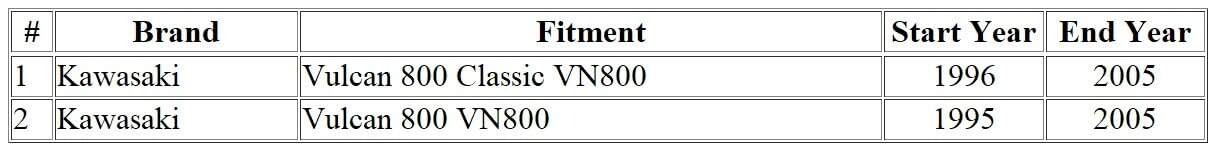 Este cable es compatible con los siguientes modelos Kawasaki 800 Vulcan 800 Classic VN800 (1996-2005) Kawasaki 800 Vulcan 800 VN800 (1995-2005)