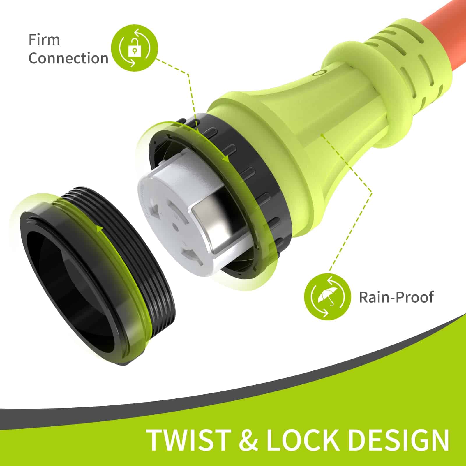 4. Diseño de Bloqueo Giratorio El cable de alimentación del generador viene con un anillo de bloqueo adicional que asegura firmemente el enchufe a la toma del RV o del hogar, evitando que el cable se resbale. No se ve afectado por huracanes, fuertes lluvias, nieve, etc.