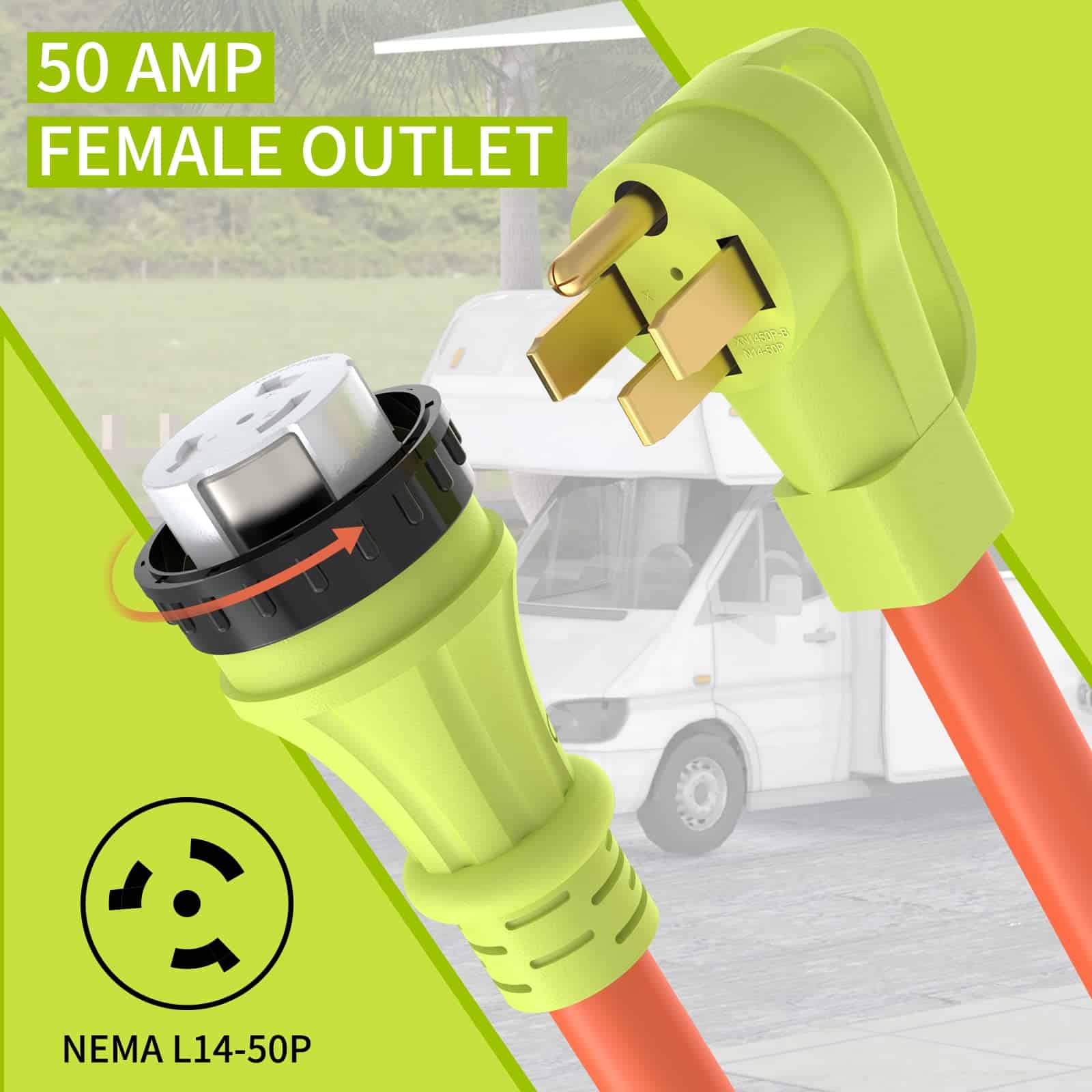 1. Especificaciones del Producto Cable de generador para RV de 50 amperios con enchufe NEMA 14-50P a toma SS2-50R, 125/250Voltios, potencia máxima de 12500 vatios, 25 pies.