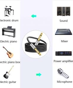 El Cable de 6.35mm Mono Jack 1/4″ TS con chapado en oro está diseñado para conectar instrumentos como sintetizadores, teclados, guitarras y otros equipos de audio profesional. Está hecho de conductores de cobre libre de oxígeno para una claridad de señal mejorada, e ideal para estudios o actuaciones en vivo.