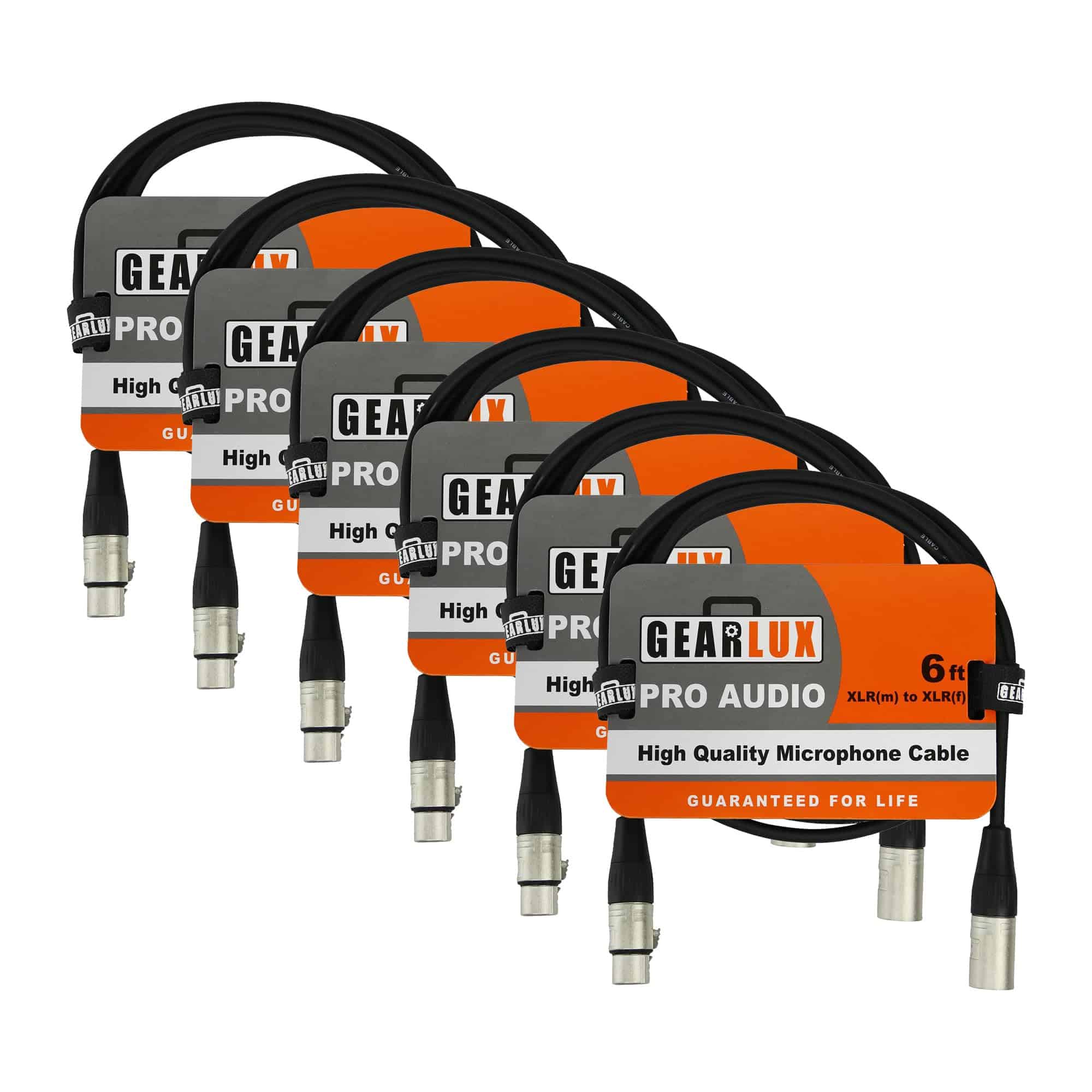 Gearlux ofrece un cable de micrófono XLR totalmente balanceado, macho a hembra, de 6 pies de longitud, en un conveniente paquete de 6 unidades.