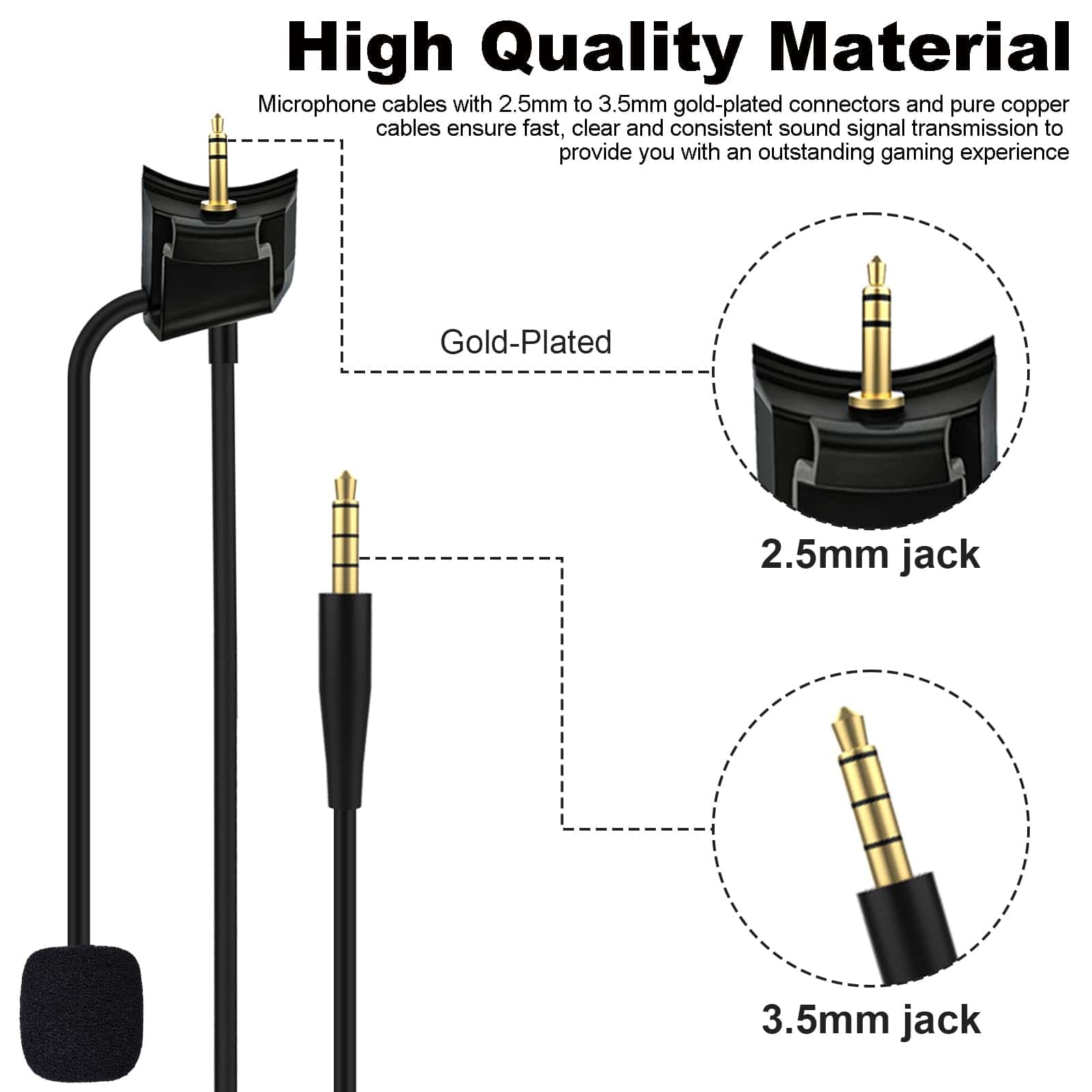 Cable de micrófono de varilla hecho de material de PVC de alta calidad, flexible, suave, duradero, diseño anti-enredo. Los conectores bañados en oro de 2,5 mm a 3,5 mm son anti-oxidación y anti-corrosión, asegurando una conexión sólida y de alta calidad entre los dispositivos conectados.