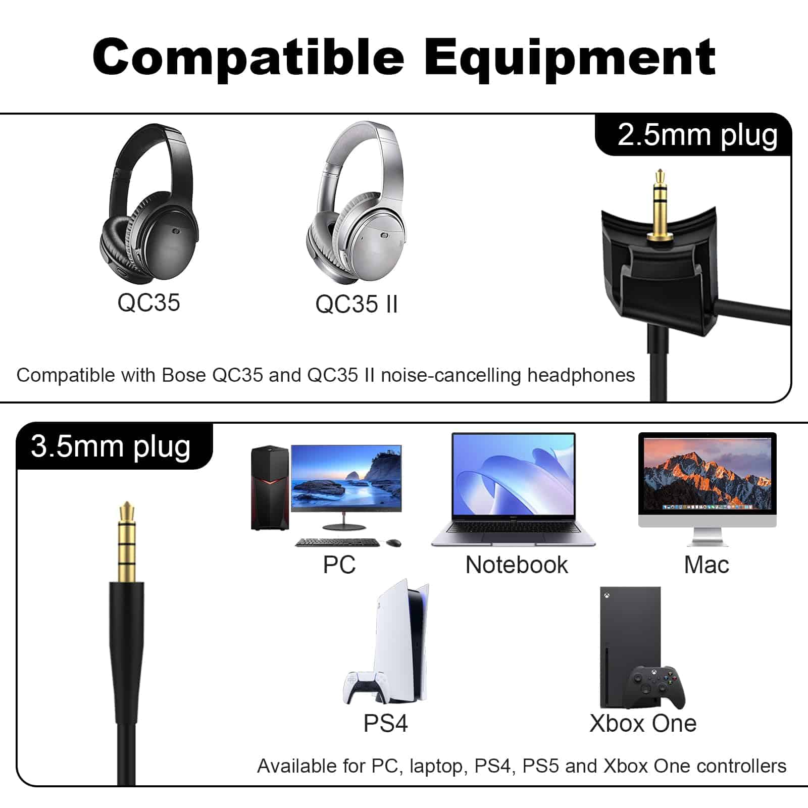 Este es un cable de audio de micrófono de 2 en 1 para juegos y uso diario, para auriculares Bose QuietComfort 35 y QuietComfort 35 II.