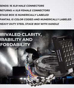El Cable de Serpiente XLR de 16 Canales de Seismic Audio es perfecto para cualquier entorno de sonido en vivo o de estudio. Con una longitud de 50 pies, este cable duradero es ideal para conectar varios equipos de audio XLR. El cable cuenta con 16 envíos XLR macho y 4 devoluciones XLR hembra, lo que lo hace versátil y fácil de usar. La caja de escenario numerada con una superficie blanca permite etiquetar cada canal de forma clara y organizada. Los conectores XLR de alta calidad garantizan una excelente calidad de sonido y una conexión segura. El fantail codificado por colores y numerado facilita la identificación de los canales. Con pares apantallados individualmente al 100% y conductores de calibre 22, este cable ofrece una transmisión de señal sin interferencias. Además, la caja de escenario de acero con asa facilita el transporte y protege el cable durante su uso. Este Cable de Serpiente XLR de Seismic Audio es una excelente adición a cualquier configuración de audio profesional.