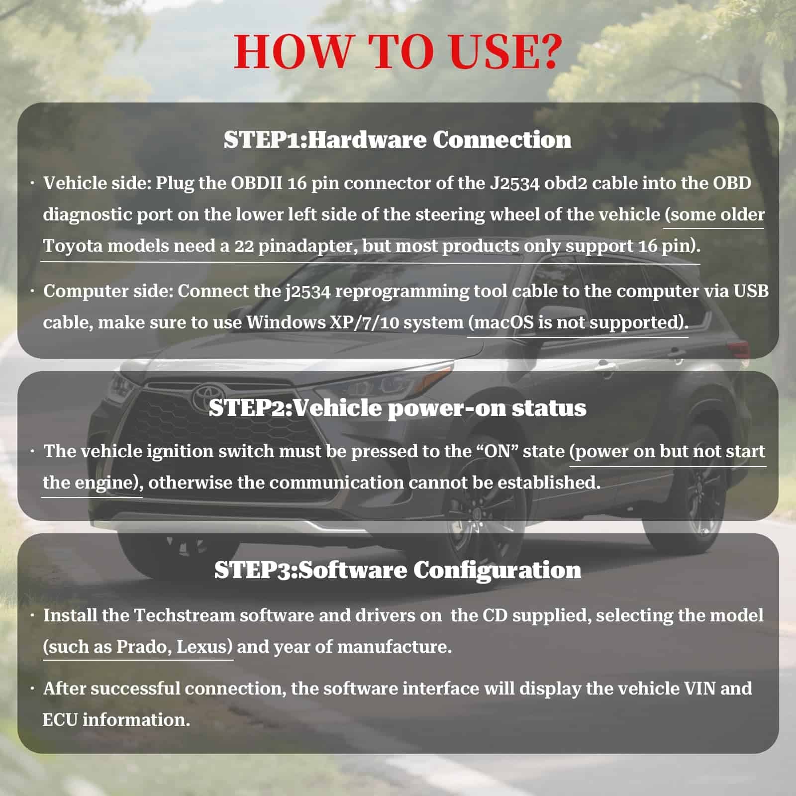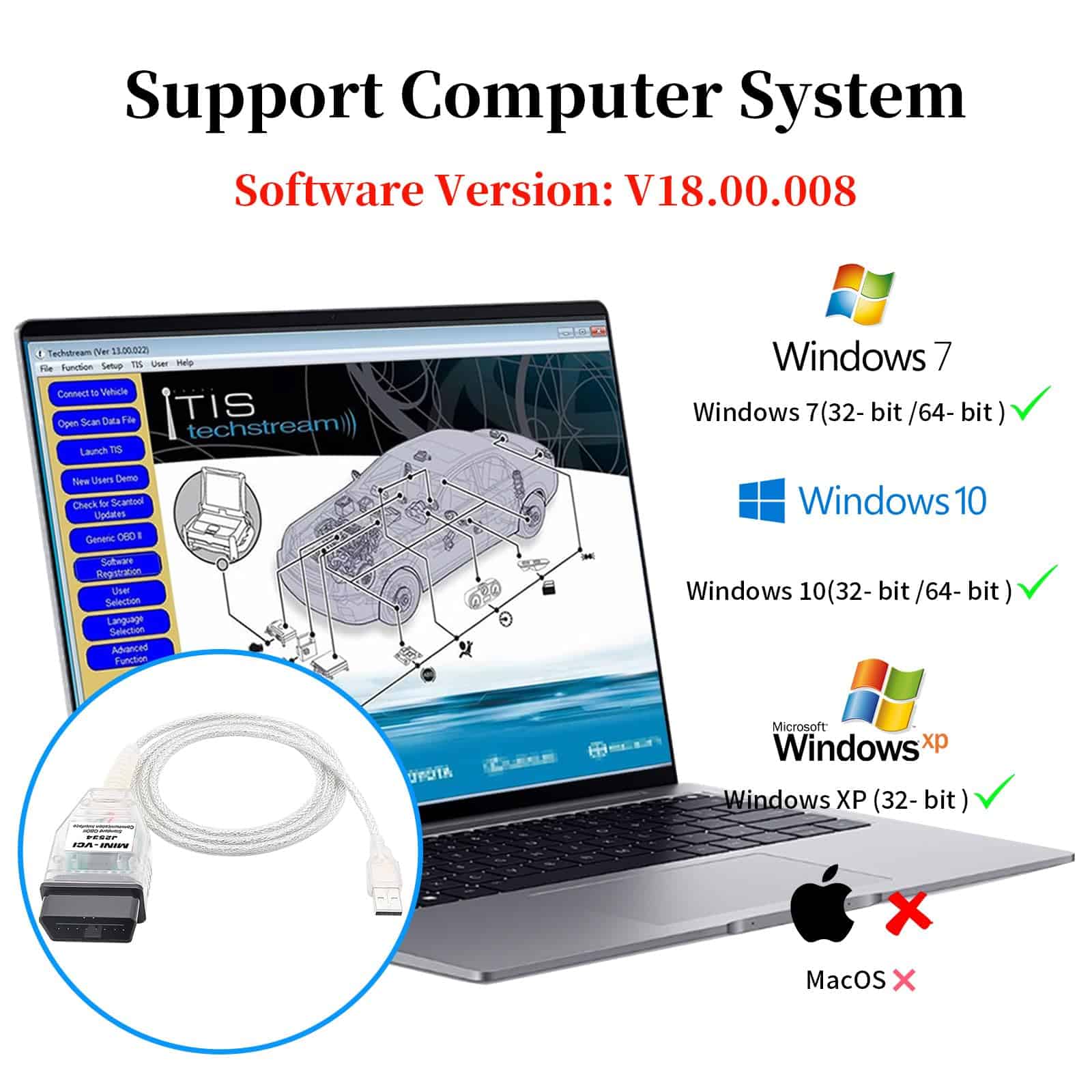 Este cable Mini Vci J2534 está diseñado para realizar diagnósticos de vehículos Toyota, Lexus y Scion de manera exhaustiva. Equipado con el software más reciente de Techstream V18.00.008, proporciona capacidades de diagnóstico actualizadas y una amplia cobertura de vehículos. Compatible con varios sistemas operativos Windows, como XP, 7 y 10, tanto en versiones de 32 bits como de 64 bits. La interfaz USB VCI J2534 garantiza una transferencia de datos estable entre el vehículo y la computadora, siguiendo los estándares de protocolo J2534. Este cable Mini VCI techstream es una herramienta esencial para los entusiastas del bricolaje, permitiendo diagnósticos de nivel profesional, reprogramación de la ECU y monitoreo de datos en tiempo real para los vehículos de la familia Toyota. No pierda la oportunidad de ahorrar su dinero con este cable Mini VCI J2534 de alta calidad.