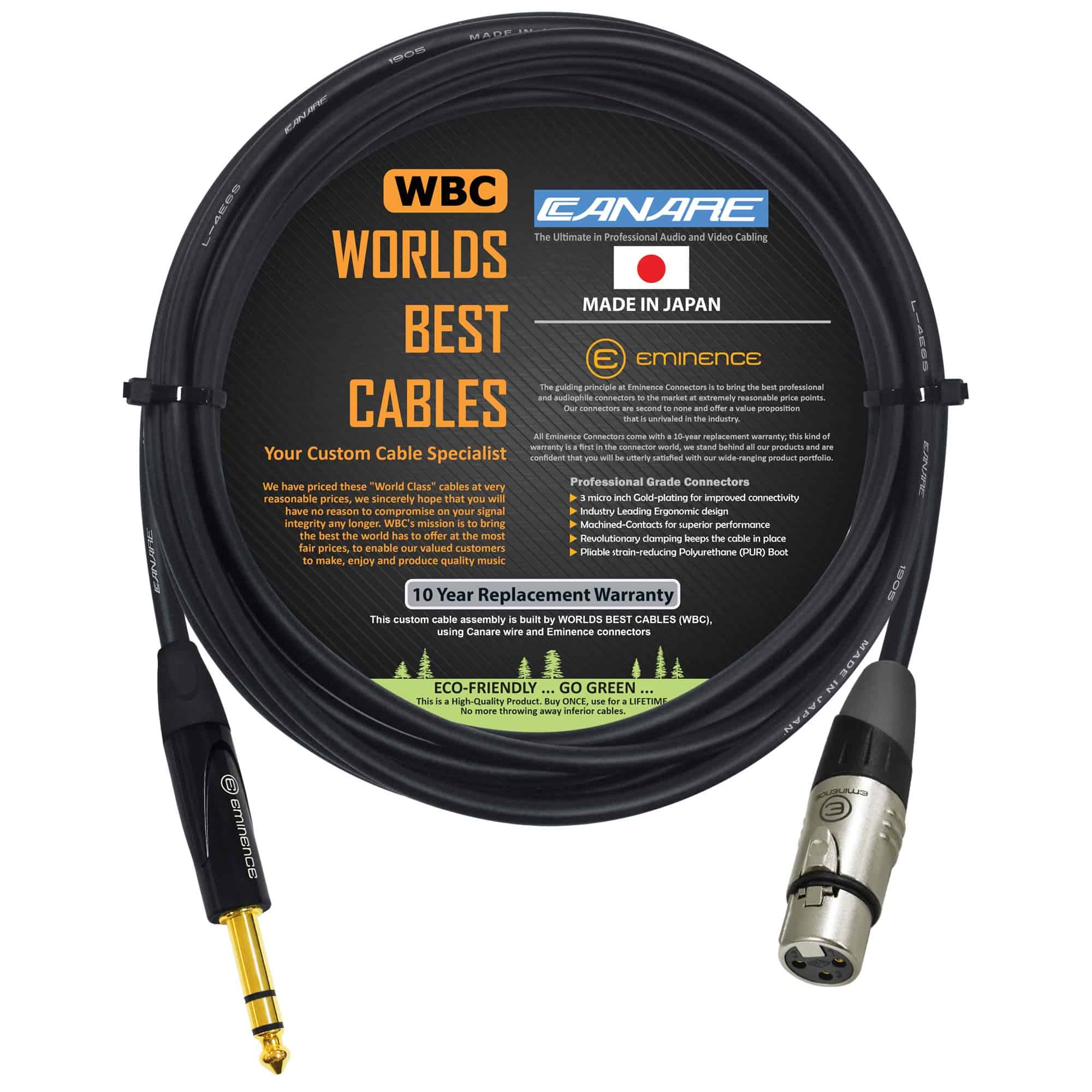 Cable de 10 pies Canare L-4E6S, Star Quad, blindado (blindaje trenzado e aislamiento de polietileno) XLR hembra equilibrado a TRS macho terminado con conectores XLR hembra Eminence E312 Gold y conectores macho TRS Gold E502 (esta venta es por un solo cable, cada cable es de 10 pies de longitud) – HECHO A MEDIDA Por WORLDS BEST CABLES. Nosotros en WBC siempre fabricamos ensamblajes de cables a medida de primera clase utilizando muchas de las principales marcas de cables y conectores, si no puedes encontrar la longitud y tipo de cable que estás buscando, no dudes en contactarnos, nos esforzaremos por ensamblar el cable requerido para ti.