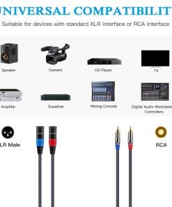 1. CALIDAD PROFESIONAL: Cable 4N OFC, alta densidad de blindaje y blindado con lámina de aluminio, terminales bañadas en oro y níquel, conectores de alta calidad no magnéticos, fabricados con material respetuoso con el medio ambiente. 2. BUENA CALIDAD DE SONIDO: Le brinda la calidad de sonido perfecta, blindaje de alta densidad y conectores bañados en oro protegen contra interferencias de radiofrecuencia (RFI) y interferencias electromagnéticas (EMI), garantizan una integridad de señal superior y una excelente protección contra la tensión. 3. RESISTENTE Y ROBUSTO: Cable resistente, la interfaz es estable en ambos extremos XLR y RCA, y funciona muy bien durante mucho tiempo. 4. FÁCIL DE USAR: Diseñado para protección contra el doblado de conectores, no se enreda fácilmente. Y el cableado cerca del suelo, fácil de ocultar. Cable dual juntos, fácil de organizar. 5. ESPECIFICACIONES: Dual XLR macho a Dual RCA macho., Dos conectores macho RCA en el primer lado, Dos conectores macho XLR en el segundo lado. 7,6m / 25 pies. Conecta dispositivos de audio con puerto de audio XLR a receptor AV, amplificador, sistema estéreo Hi Fi, sistema de cine en casa, sonido de computadora, equipo de grabación, altavoz, TV, CD, DVD, consola de mezcla y más.
