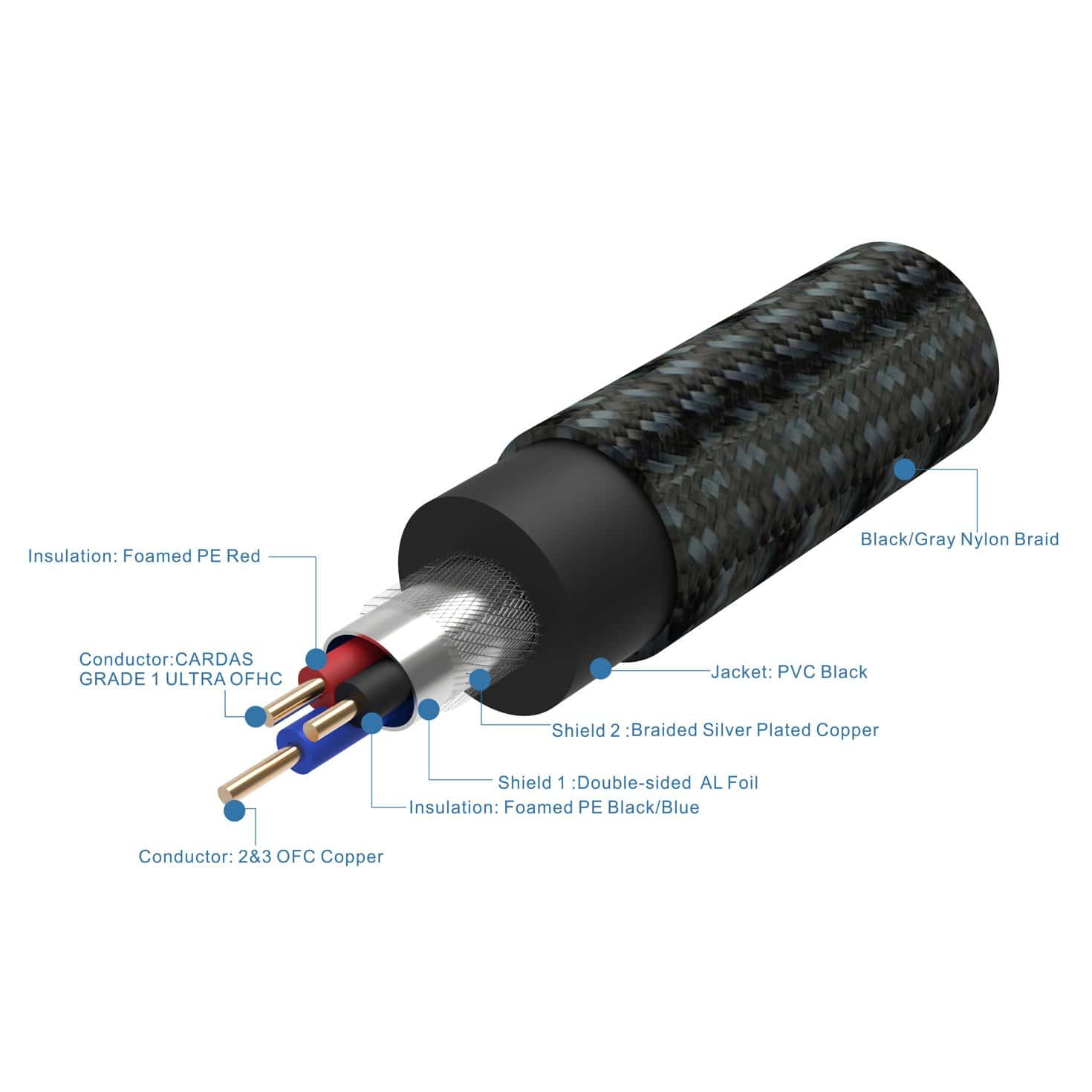 1. Conductores utilizan cobre de grado uno de Cardas hecho en EE. UU. 2. Conductor sólido separado de cobre de grado uno de Cardas para los canales derecho e izquierdo. 3. Conductores de cobre OFC retornan por separado. 4. Los conductores de cada canal están envueltos en un blindaje de lámina. 5. Terminación del cable XLR a XLR soldado a mano
