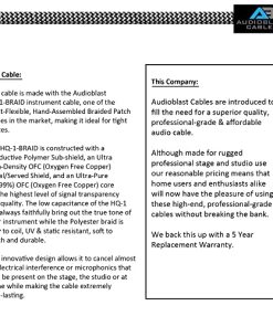 1. Audioblast HQ-1-BRAID es el cable de instrumento de grado profesional más flexible ideal para una multitud de aplicaciones de parcheo. El subblindaje conductivo de PVC, el blindaje servido y el núcleo ultra puro de OFC garantizan niveles más altos de transparencia y calidad de señal, cancelando casi toda la interferencia eléctrica y microfonía. La baja capacitancia de la HQ-1 (38.2 pf / pie) siempre hará que salga fielmente el verdadero tono de tu instrumento. La trenza es fácil de enrollar, resistente estática, suave y duradera.