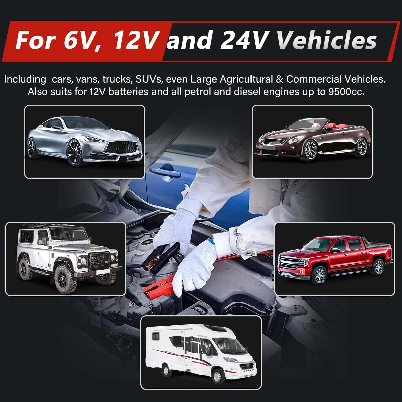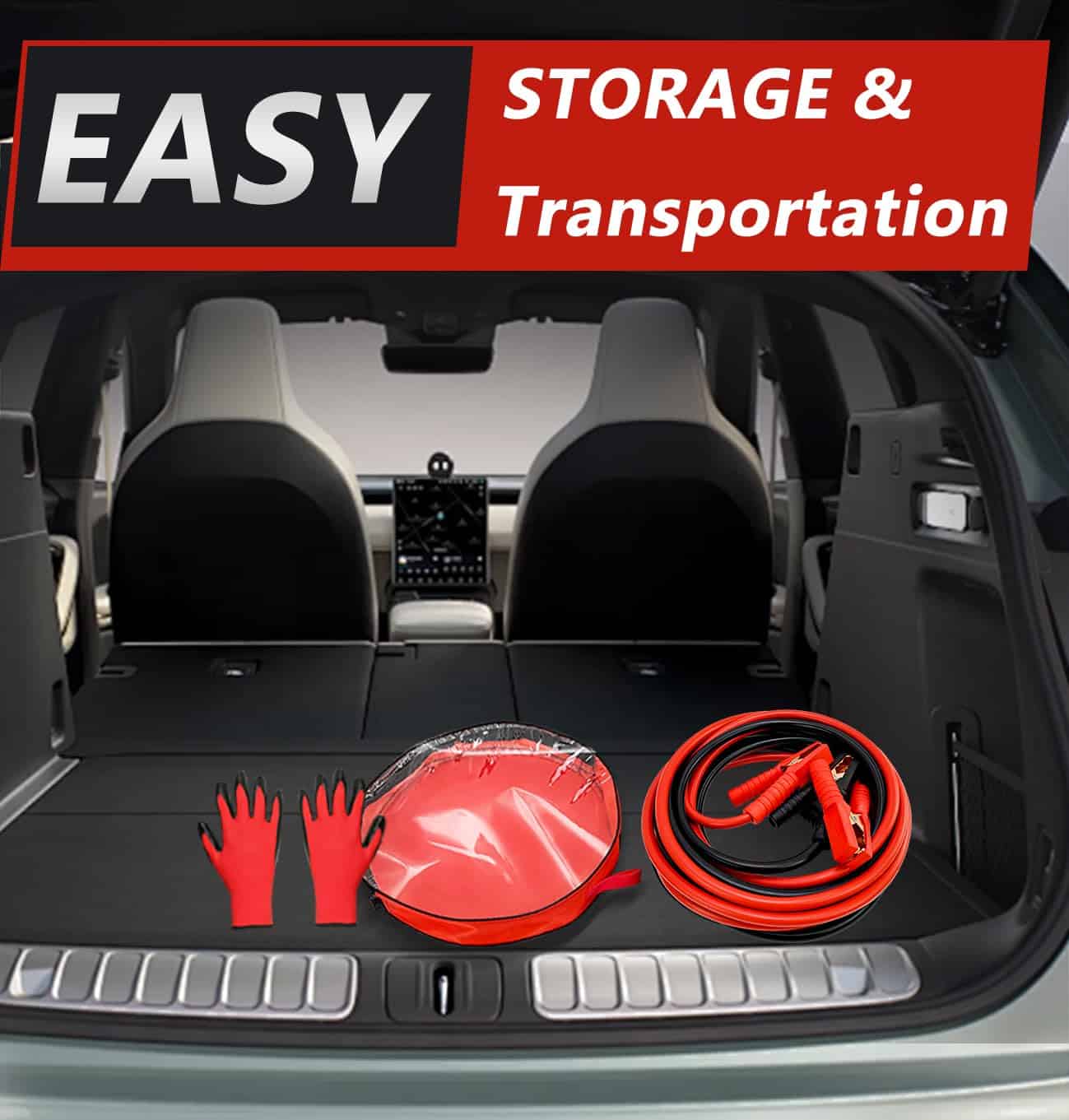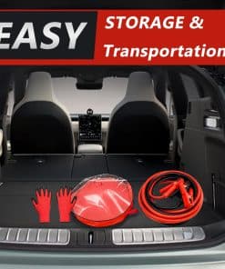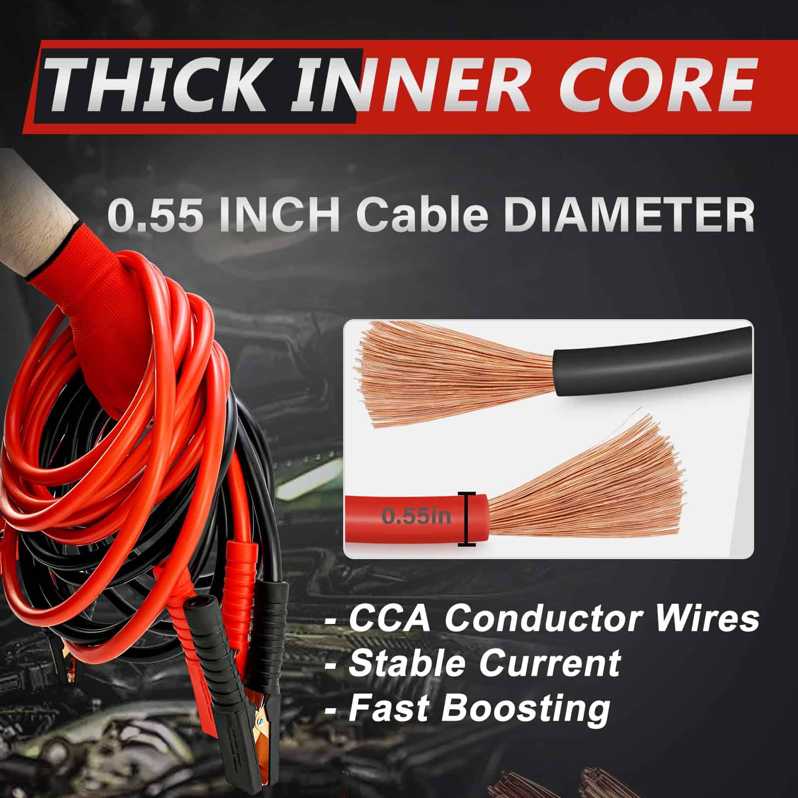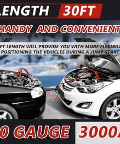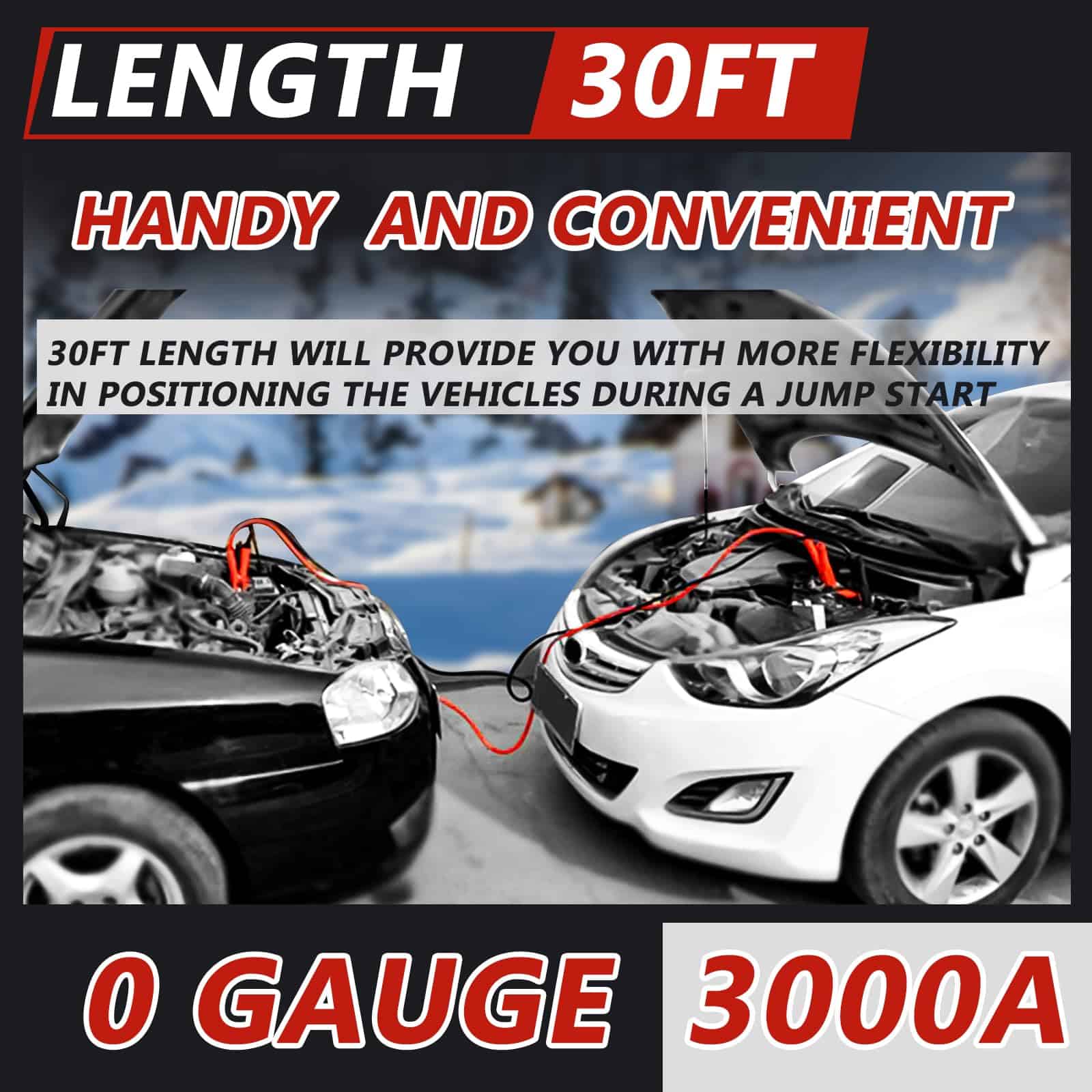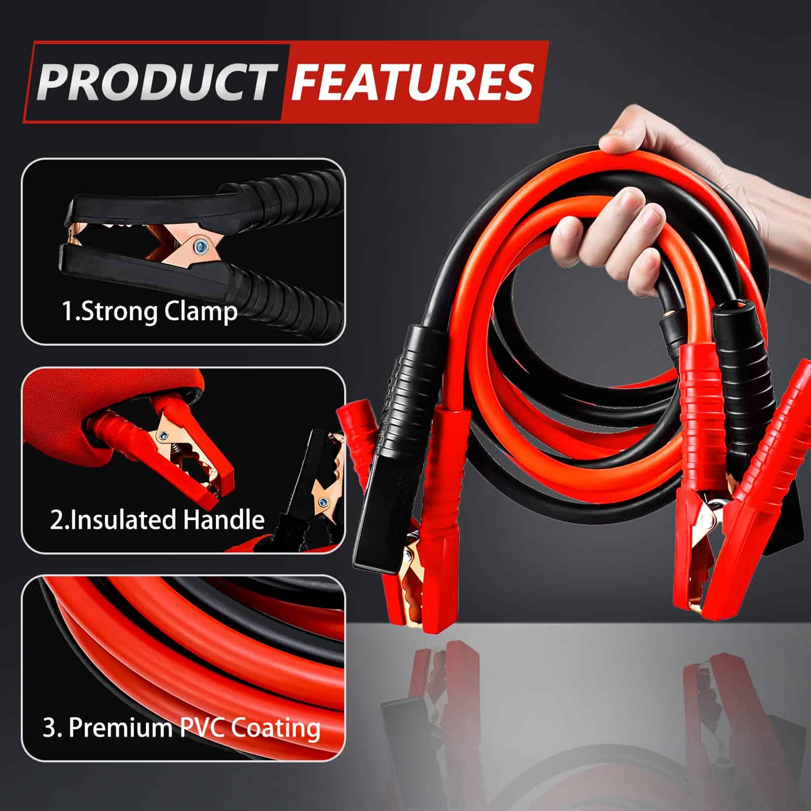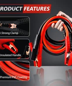 Cables de arranque pesados Calibre 0 con diámetro de cable de 0.55″, estos cables de arranque de calibre 0 de 3000AMP están diseñados para arrancar baterías muertas o débiles, soportarán una corriente máxima de 3000A para arrancar baterías de coche de 12V y 24V. Seguro y confiable Construido con aislamiento duradero resistente a la abrasión y pinzas resistentes, nuestros cables de arranque proporcionarán una conexión segura y una operación segura, garantizando durabilidad y fiabilidad. 30 pies de cables de refuerzo extra largos Con una longitud de 20 pies sin enredos, nuestros cables de arranque brindan un amplio alcance entre vehículos, lo que asegura arrancar la batería de cualquier otro coche con facilidad, ya sea estacionado en la parte trasera o delantera. Viene con estuche con cremallera y asa para un almacenamiento y transporte fácil. Resistencia a bajas temperaturas Estos cables de arranque funcionan bien incluso en condiciones de baja temperatura, lo que los hace listos para la temporada de invierno cuando las baterías tienden a debilitarse. Aplicación versátil Estos cables de arranque pesados son imprescindibles para cualquier propietario de vehículo, ideal para vehículos de 6V, 12V y 24V, incluidos coches, furgonetas, camiones, SUV, incluso grandes vehículos agrícolas y comerciales. También es adecuado para baterías de 12V y todos los motores de gasolina y diésel de hasta 9500cc.