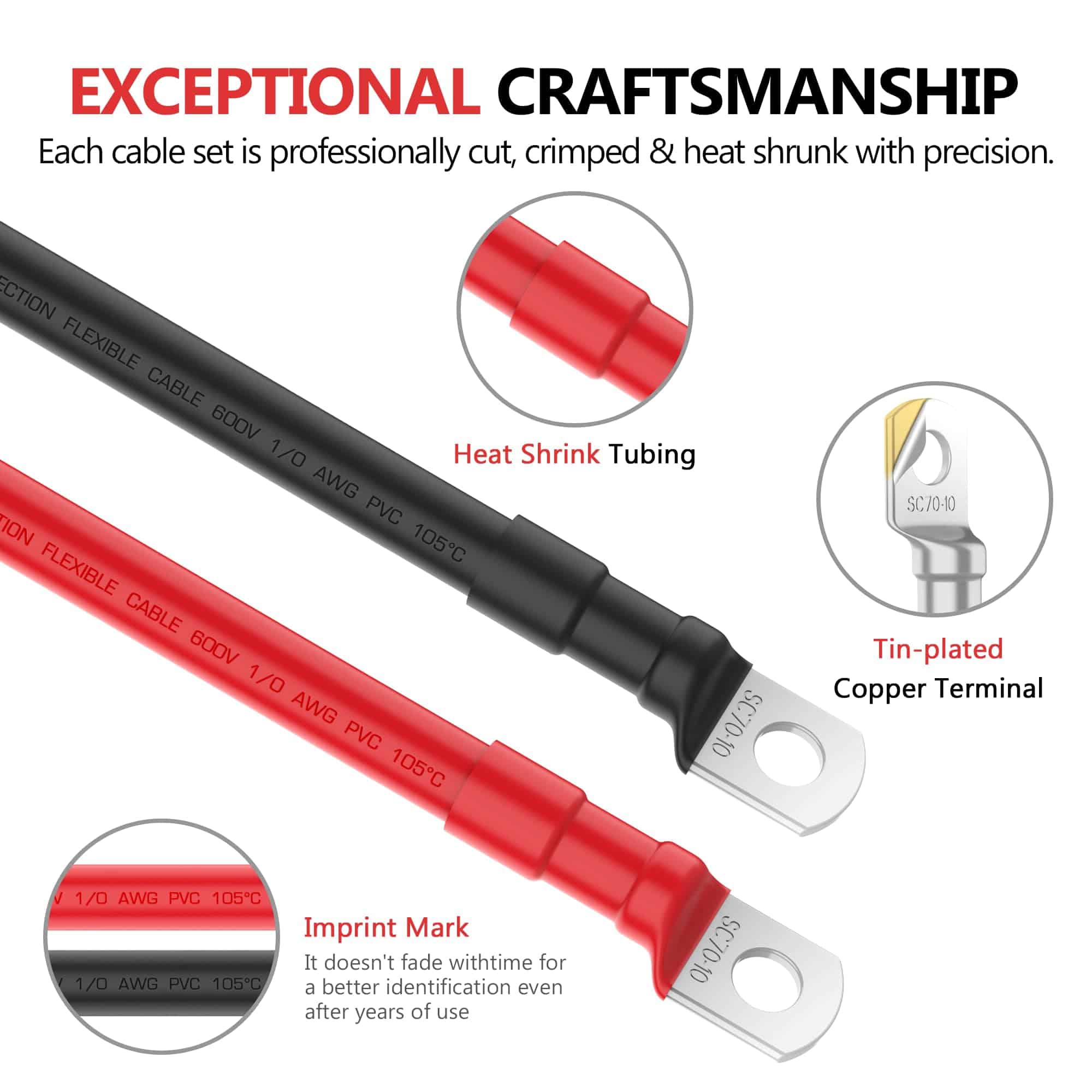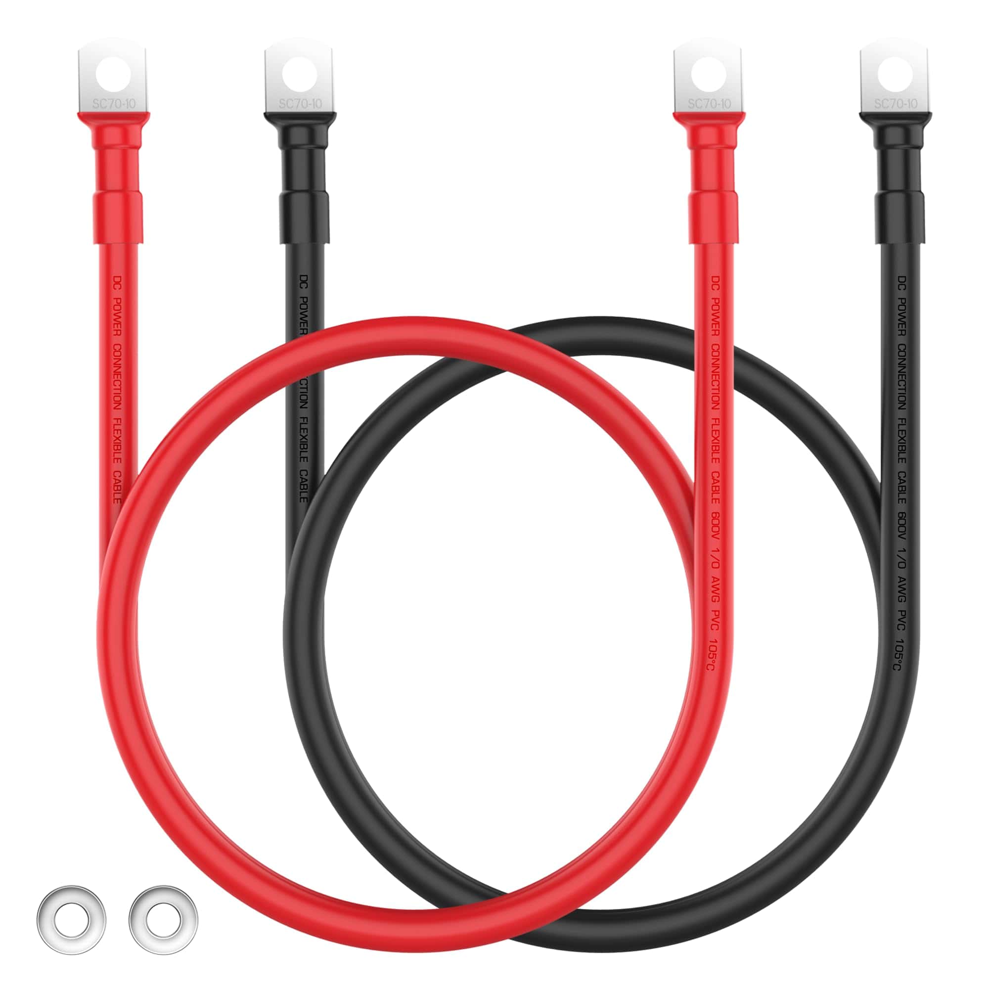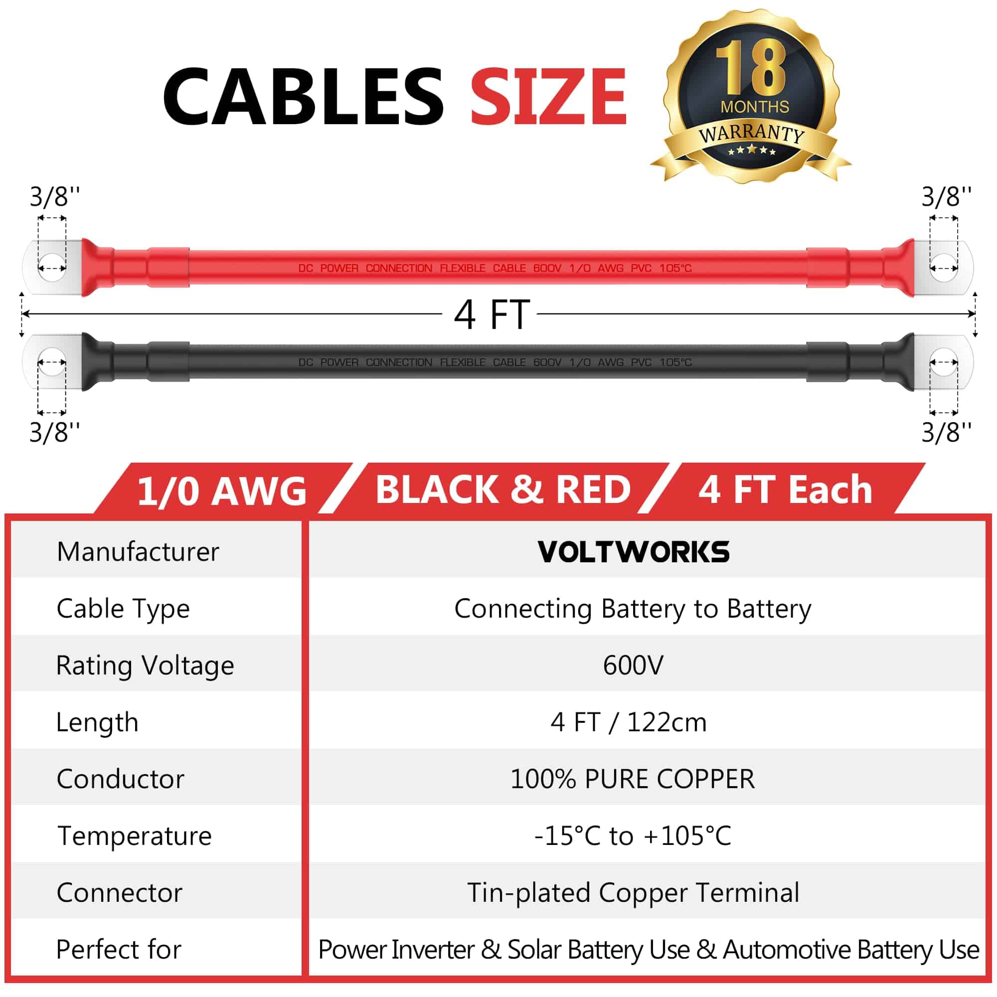Cables de batería de cobre puro rojo + negro 1/0 AWG VOLTWORKS para inversor solar, RV, coche, barco 4ft 3/8 in Lugs. Ambos cables de batería están hechos de cobre y tienen una buena conductividad eléctrica. Incluye 1 cable positivo (rojo) y 1 cable negativo (negro). La longitud es de 4 pies y el calibre es de 1/0 AWG, adecuado para pernos de 3/8″. Los terminales de cobre de calibre 1/0 están recubiertos de estaño, bien prensados y utilizan un diseño de extremo cerrado para protección contra la corrosión. Resistentes al calor hasta 105°C. La cubierta exterior del cable de batería está hecha de un exclusivo forro aislante de PVC, que tiene una excelente aislación térmica. Los cables de batería 1/0 AWG se utilizan ampliamente para inversores de energía, automóviles, vehículos, RV, camiones, aplicaciones solares, barcos, etc. Los cables de cobre evitan la corrosión y resisten los entornos severos. Los cables de batería 1/0 AWG vienen con dos terminales de anillo que se pueden conectar fácilmente a los desconectores/interruptores de batería. El paquete incluye un par de cables de batería de 4 pies 1/0 AWG, garantía de 18 meses, devolución sin problemas de 30 días y un servicio al cliente amable y paciente después de la venta. Puedes comprar nuestros cables de batería de calibre 1/0 con confianza.
