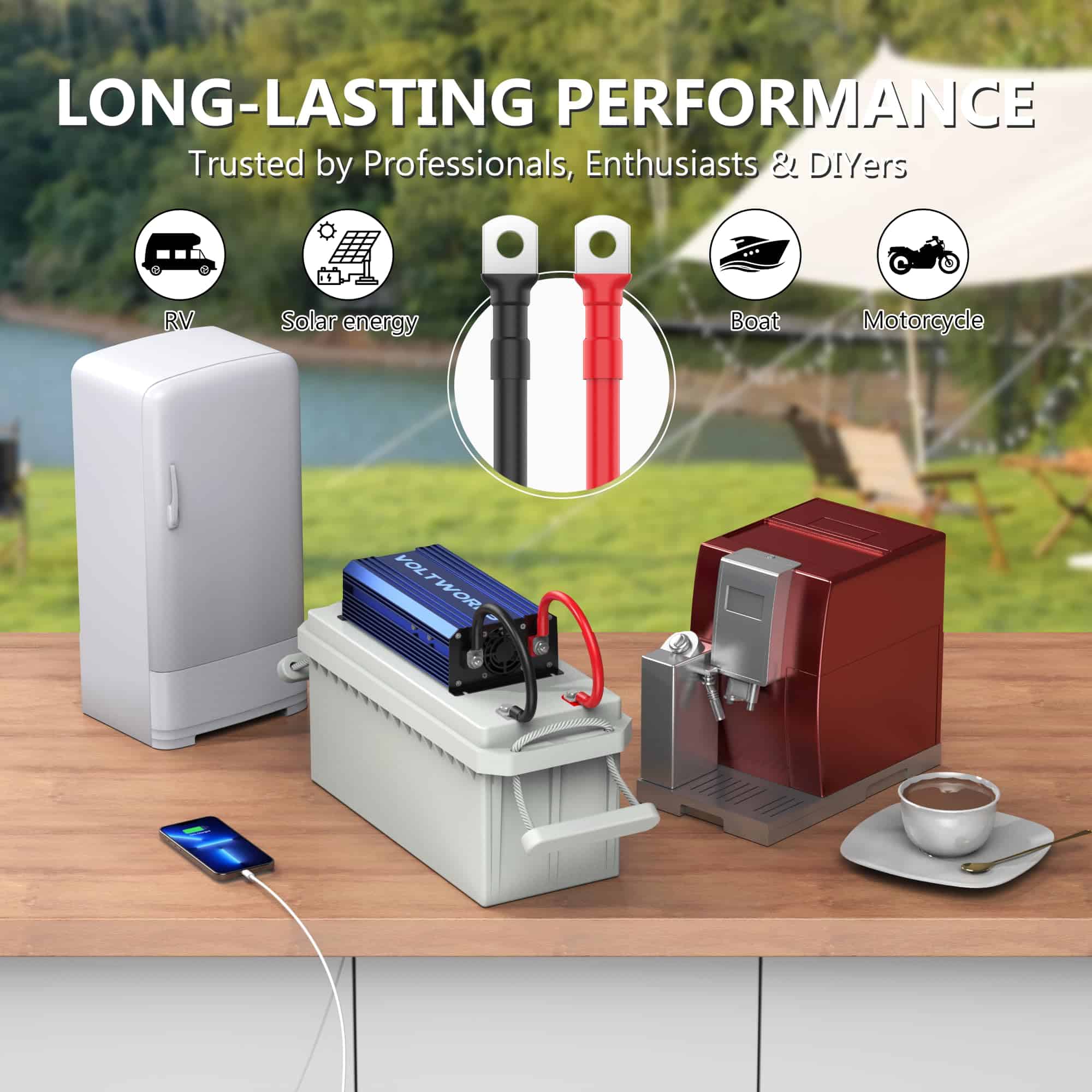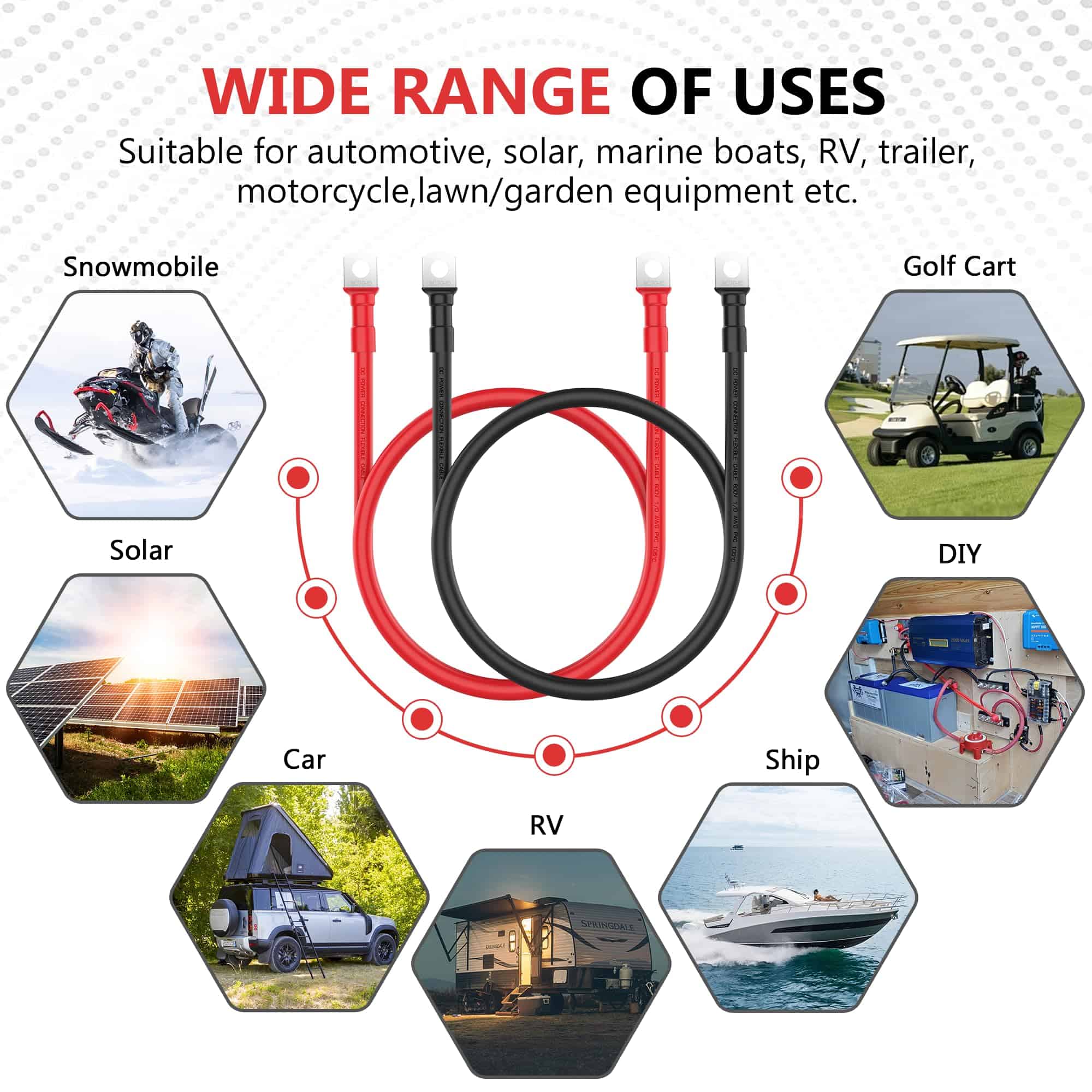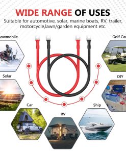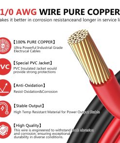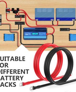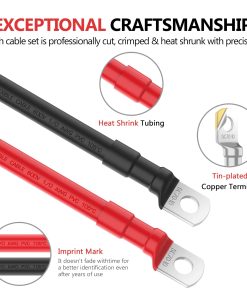 Cables de batería de cobre puro rojo + negro 1/0 AWG VOLTWORKS para inversor solar, RV, coche, barco 4ft 3/8 in Lugs. Ambos cables de batería están hechos de cobre y tienen una buena conductividad eléctrica. Incluye 1 cable positivo (rojo) y 1 cable negativo (negro). La longitud es de 4 pies y el calibre es de 1/0 AWG, adecuado para pernos de 3/8″. Los terminales de cobre de calibre 1/0 están recubiertos de estaño, bien prensados y utilizan un diseño de extremo cerrado para protección contra la corrosión. Resistentes al calor hasta 105°C. La cubierta exterior del cable de batería está hecha de un exclusivo forro aislante de PVC, que tiene una excelente aislación térmica. Los cables de batería 1/0 AWG se utilizan ampliamente para inversores de energía, automóviles, vehículos, RV, camiones, aplicaciones solares, barcos, etc. Los cables de cobre evitan la corrosión y resisten los entornos severos. Los cables de batería 1/0 AWG vienen con dos terminales de anillo que se pueden conectar fácilmente a los desconectores/interruptores de batería. El paquete incluye un par de cables de batería de 4 pies 1/0 AWG, garantía de 18 meses, devolución sin problemas de 30 días y un servicio al cliente amable y paciente después de la venta. Puedes comprar nuestros cables de batería de calibre 1/0 con confianza.