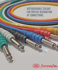 Cables de Parche Mono Unbalanced Multicolor de 1/4 (6.35mm) TS a 1/4 (6.35mm) TS – Paquete de 6 (3ft) para Equipos Externos y Patchbays de Estudio Efectos Digitales Analógicos Varios Colores Un patchbay te permite crear rutas de señal de audio personalizadas. Conectas tus micrófonos, equipos externos e interfaz de audio a la parte trasera de un patchbay, y luego creas cadenas de procesamiento personalizadas formando conexiones entre los jacks en la parte frontal del patchbay, utilizando cables de patchbay. Por ejemplo, podrías utilizar un patchbay para enrutar la señal que viene de un micrófono a un preamplificador de micrófono, a través de un compresor externo, hacia tu interfaz de audio, y luego a tu DAW. Hay dos beneficios principales al usar un patchbay. El primero es que te permite crear rápidamente rutas de señal personalizadas, sin tener que rebuscar detrás de tu hardware, conectando y desconectando cables. El segundo es que evita el desgaste en tu hardware. Dado que típicamente no desconectas hardware de la parte trasera de tu patchbay, a menos que consigas nuevos equipos, los únicos cables y jacks que se deterioran con el tiempo son los cables de patchbay y los jacks en el patchbay en sí, que son mucho más baratos de reemplazar que los cables utilizados para conectar equipos en la parte trasera de tu patchbay, y los jacks en tus unidades de hardware. Cuando se trata de diseño de cables de audio, AxcessAbles mantiene la atención en los detalles básicos, y puedes escuchar esta atención en su sonido. Para que tu próxima experiencia musical sea extraordinaria, ¡adquiere un cable de AxcessAbles hoy! ¡GARANTÍA DE 1 AÑO de AxcessAbles: ¡Te respaldamos! Nuestros productos están diseñados para aliviar tus problemas técnicos, no para añadir más. Nuestro amigable soporte con sede en EE. UU. está aquí para ayudarte