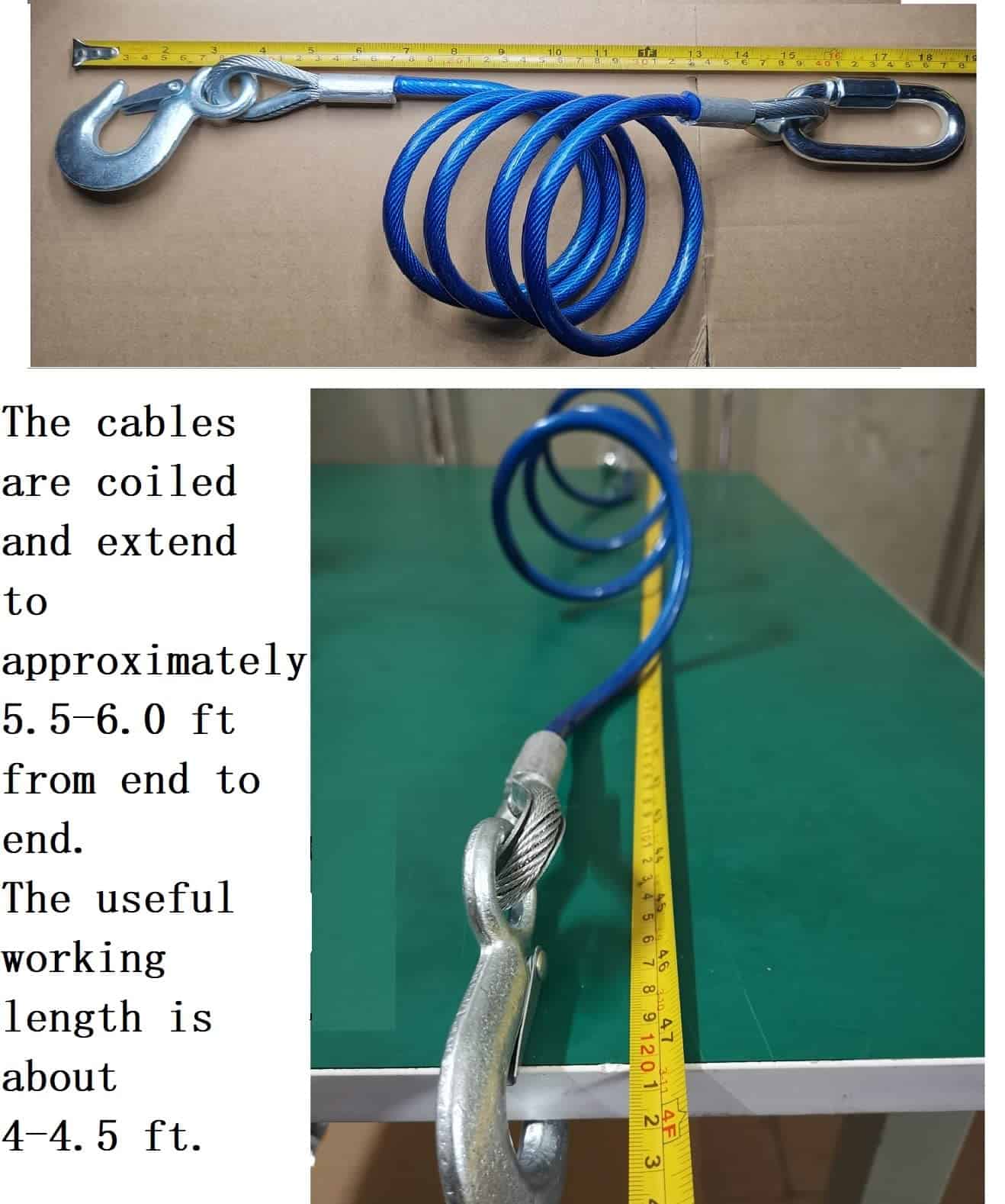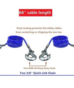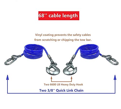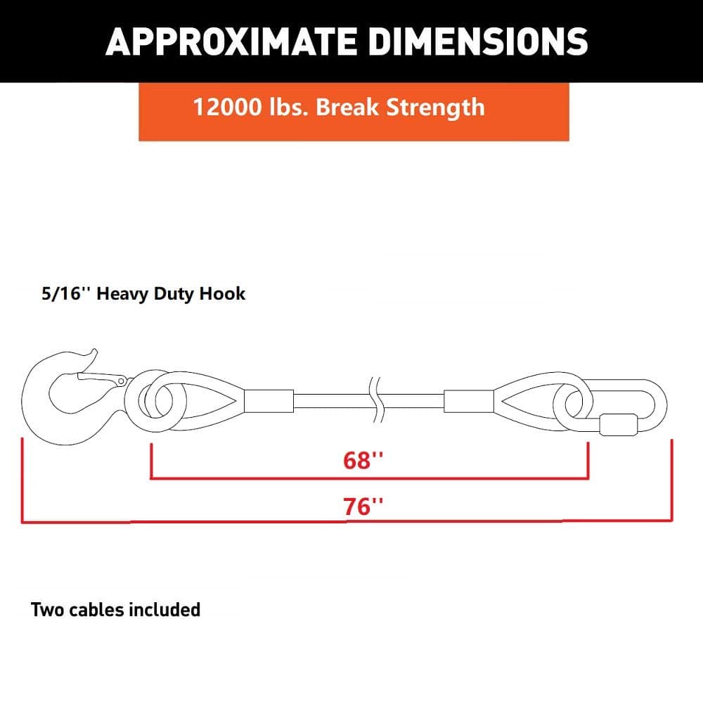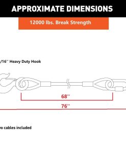 Cables de Seguridad para Remolque de 68 pulgadas de longitud, Capacidad de carga de 12,000 lbs – Un par: Contiene 1. 2 cables. (Uno de 68 pulgadas de longitud y capacidad de carga de 12,000 lbs) 2. Dos ganchos rápidos. (Un par tiene capacidad de carga de 12,000 lbs) 3. Dos enlaces rápidos. (Un par tiene capacidad de carga de 12,000 lbs)