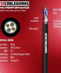 1. Cable de Micrófono XLR Macho a XLR Hembra de 20 Pies. 2. Baja Capacitancia Permite Más Flujo de Señal y Evita la Pérdida de Frecuencia. 3. Conductor de Cobre Cuádruple de Núcleo Fino de Oxígeno Libre del 99.99% con Blindaje Trenzado. 4. Conectores de Latón Chapados en Oro. 5. Conectores Patentados Propios de Cableworks con Abrazadera de Cable de Estilo Chuck para Conexiones de Cable Seguras y Anillos de Identificación de Color TORIColor.