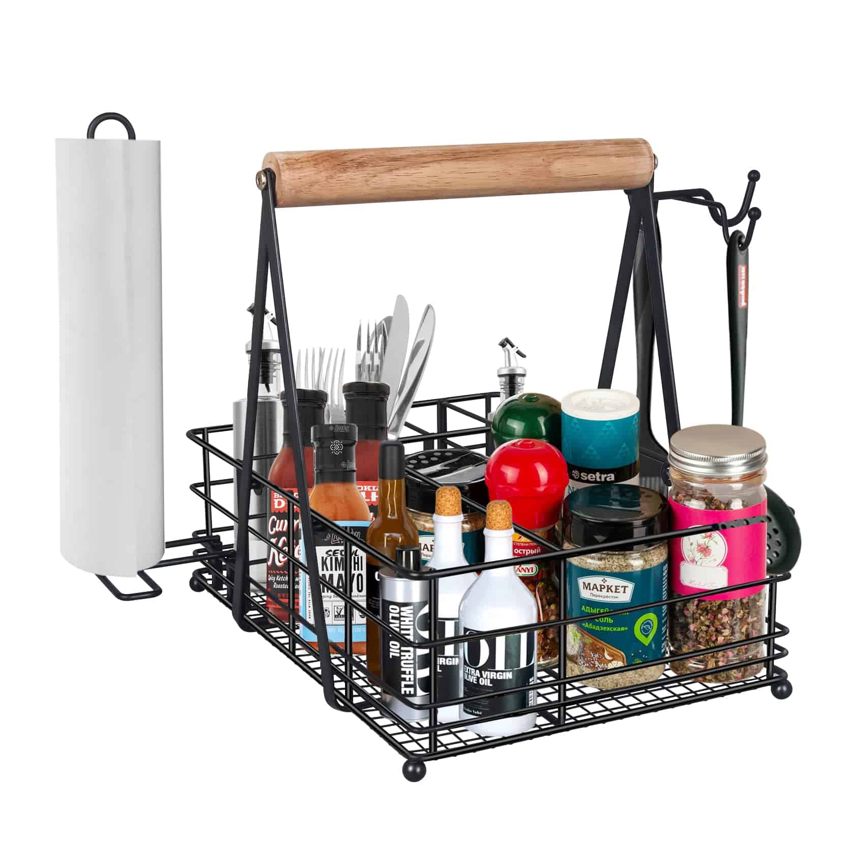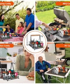 1. GRAN Caddy de Parrilla BBQ: El resistente caddy de utensilios para parrilla mide 13.38″ x 10″ x 12″. Fácilmente contiene especias, condimentos, platos, utensilios, servilletas, rollos de papel de cocina, herramientas para parrilla, cucharas, tazas de camping y más. Mantiene tu hogar de camión RV ordenado y limpio. Utiliza este caddy de almacenamiento para recoger los elementos dispersos y llevarlos con facilidad a donde pertenecen.