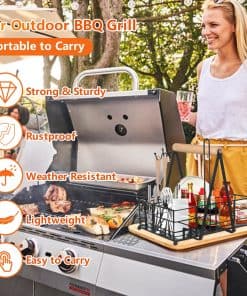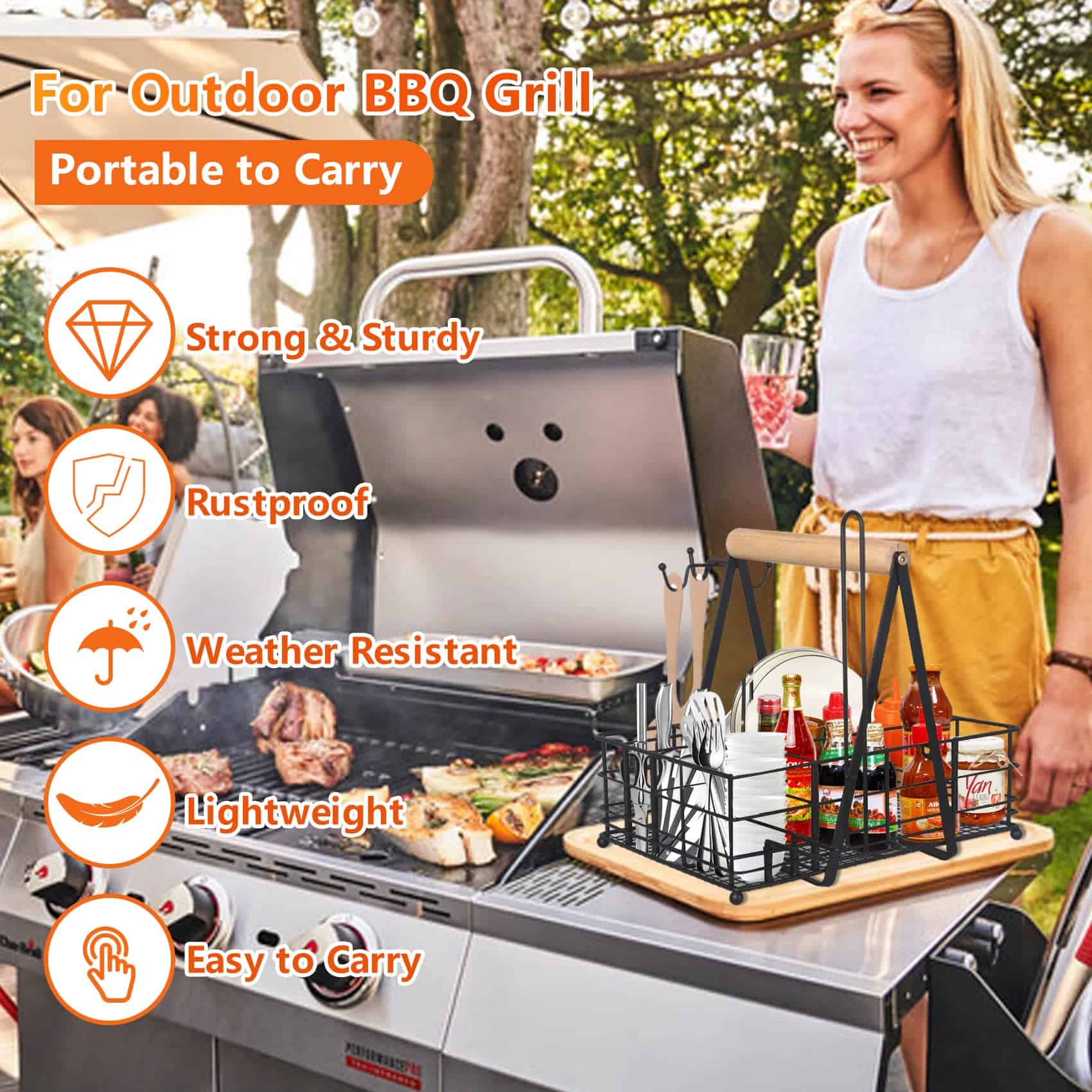 5. Acero sólido de alta resistencia Premium: El marco de cesta de acero inoxidable de todo el caddy de utensilios está recubierto con material a prueba de óxido para ayudar a protegerlo del daño, hecho para resistencia al óxido y durabilidad. No se doblará, deformará o romperá fácilmente. Este es el mejor regalo para los hombres que aman la parrilla exterior y el camping
