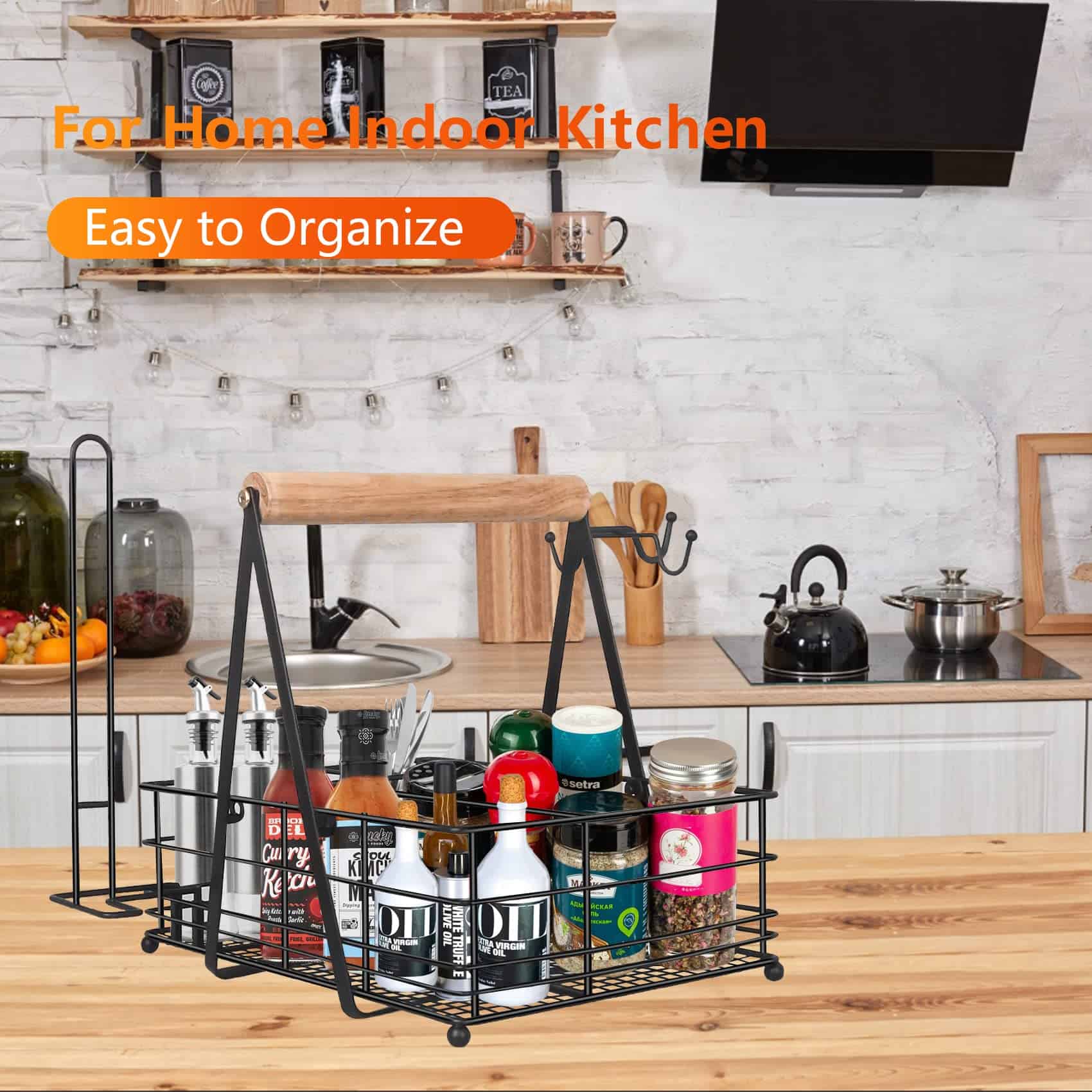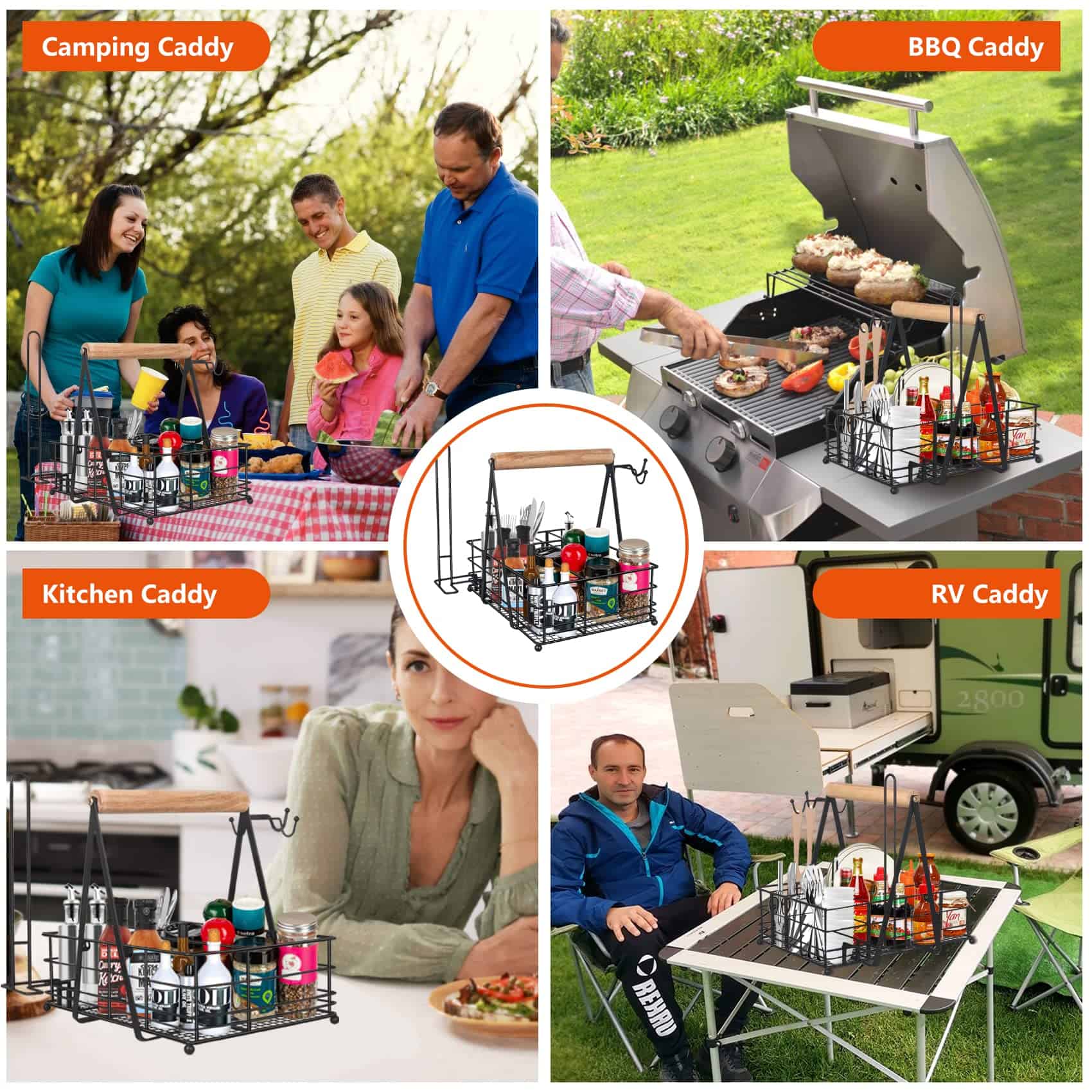 3. Cesta de Parrilla con Portarrollos de Papel: Nuestro caddy de picnic viene con 6 compartimentos, 3 ganchos y un portarrollos de papel, puedes utilizar esto como un caddy de utensilios, caddy de parrilla, caddy de camping, caddy de condimentos, caddy de limpieza, caddy de mesa de cocina, cesta de picnic, u organizador de camping, ¡excelentes accesorios de cocina exterior! ¡Es perfecto para tailgating, cocina exterior, camping, fiestas en el patio trasero, parrilladas, picnics, barbacoas para camperos y RVs.