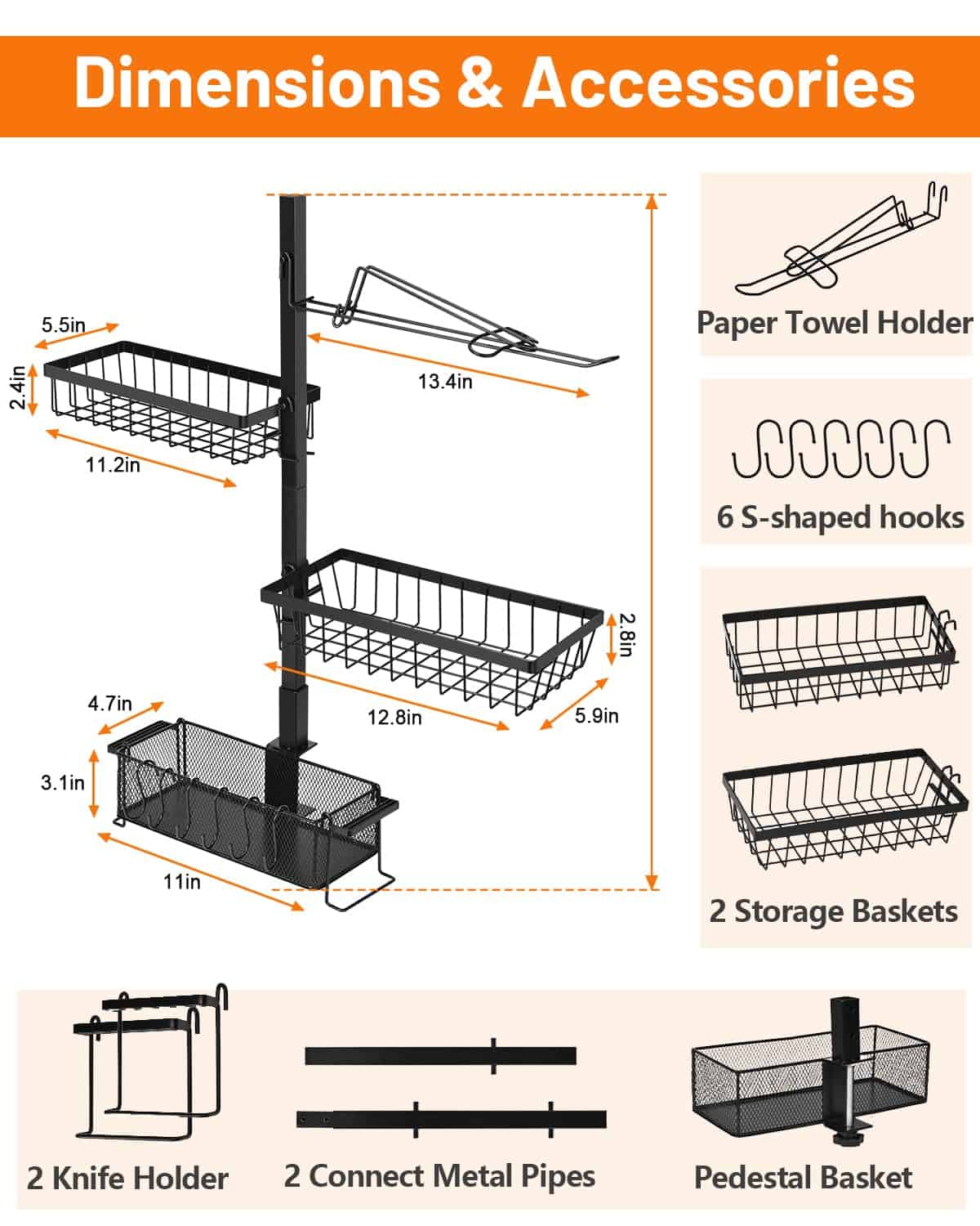 2. Almacenamiento Vertical Eficiente Con un diseño vertical único, cuenta con un portarrollos de papel para asar BBQ en la capa superior para un acceso fácil. La capa intermedia está equipada con dos canastas, que pueden clasificar y almacenar varios botes y frascos de condimentos, manteniendo los objetos ordenados. La capa inferior también tiene una canasta para herramientas y está adicionalmente equipada con 6 ganchos en S para colgar fácilmente tijeras, cepillos, etc. Mejora de manera integral la eficiencia de almacenamiento de los suministros para parrilladas, sirviendo como un excelente caddy de BBQ y accesorios de plancha Blackstone.