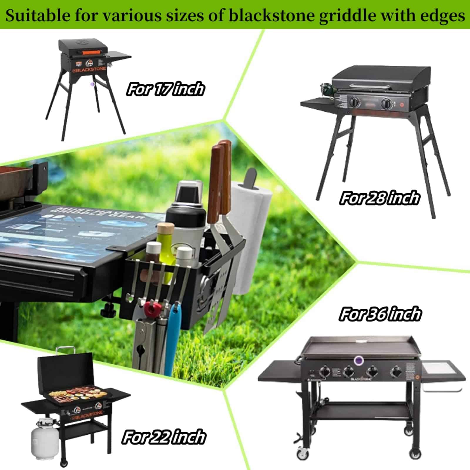 5. Garantía posventa Nuestro caddy para parrilla está fabricado con hierro de grosor de alta calidad, resistente y duradero sin oxidarse. Adecuado para parrillas de 28 pulgadas y 36 pulgadas. ¡Este organizador de caddy para parrilla Blackstone es una herramienta perfecta para cenas de barbacoa, picnics, campamentos! Si tiene alguna pregunta sobre nuestro caddy para parrilla, por favor contáctenos.