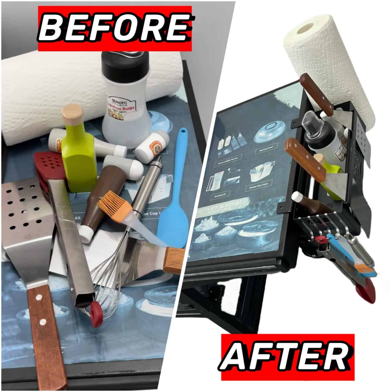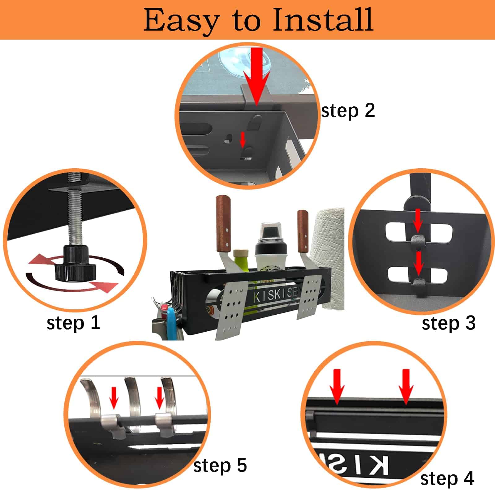 4. Fácil de instalar y extraíble Muy fácil de instalar. Primero, fije el estante de almacenamiento a uno de los lados de la Parrilla a través de los dos soportes de montaje con tornillos. Luego instale el portacuchillos y el gancho en el borde de la caja de almacenamiento. Además, instale el estante de almacenamiento de papel de cocina en las hebillas de ambos lados de la caja de almacenamiento. Muy conveniente de operar y fácil de almacenar.