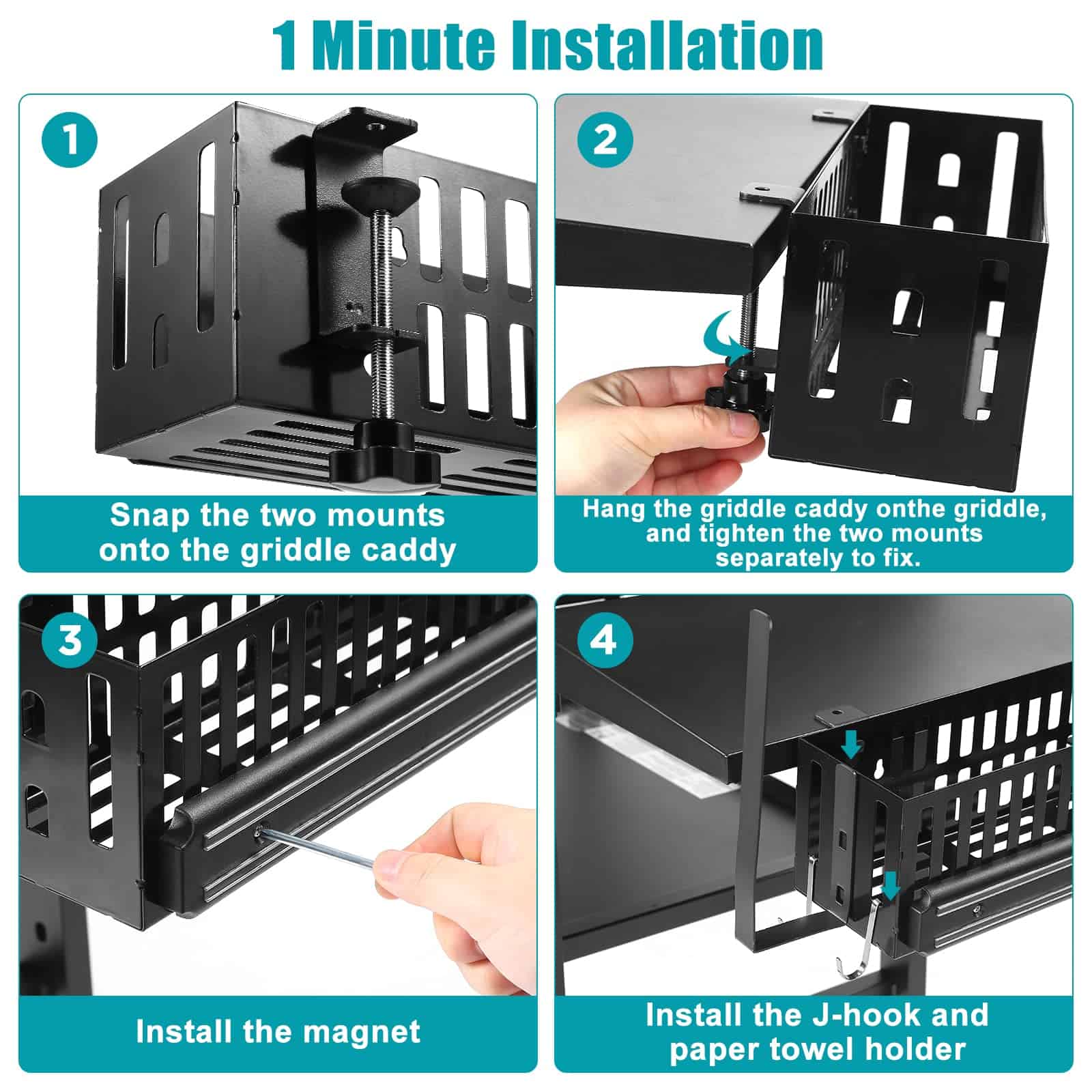 5. Perfecto para Exteriores: Nuestra caja de almacenamiento de accesorios para barbacoa es adecuada para varias situaciones, convirtiéndola en un gran ayudante para barbacoas al aire libre, picnics o viajes de campamento. ¡Solo toma un minuto instalarlo y no se requiere taladrar, lo cual es muy conveniente y mantiene todas tus herramientas ordenadas y listas para usar con nuestro caddy de plancha!